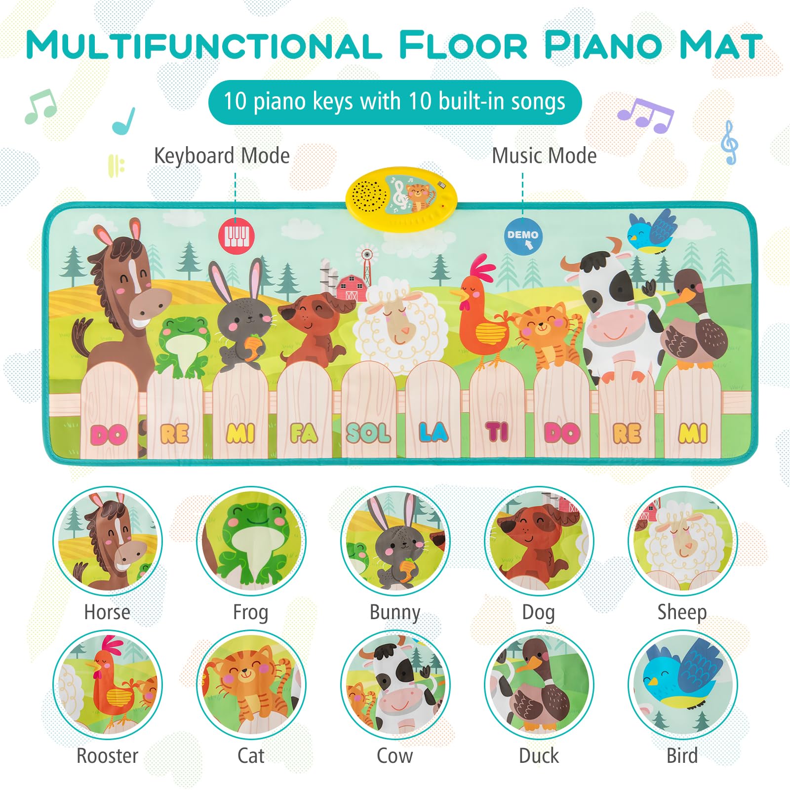 This piano music mat features 10 touch-sensitive keys for kids to explore their musical creativity and 10 built-in songs to encourage kids to dance to their own beats. Moreover, the play mat includes 10 animal sounds, adding an educational twist that helps children learn and recognize different animal sounds. Crafted for safety and comfort, the mat boasts soft padding to ensure a cushioned surface for playful activity and a non-slip bottom to prevent slides. Portable and foldable, this lightweight touch step play mat is easy to store and perfect for indoor & outdoor use. Ideal as a gift, this piano mat is an excellent educational tool, aiding in the growth of motor skills, coordination, auditory development and music enlightenment.