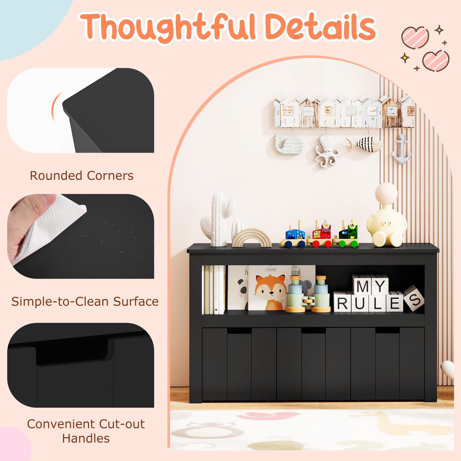 After breakfast, children can effortlessly pull their favorite toys from the three deep drawers and spread crayons and books across the wide tabletop for a morning drawing session. When playtime is over, they can simply slide the wheeled drawers back into place, turning cleanup into a fun activity that fosters independence. Perfect for bedrooms, playrooms, or classroom corners, this toy storage cabinet keeps art supplies, storybooks, and snacks within reach while maintaining a neat and organized space. Crafted from premium MDF with rounded edges and a kid-friendly height, it is safe, durable, and easy to clean—allowing parents to focus on enjoying precious moments with their children.