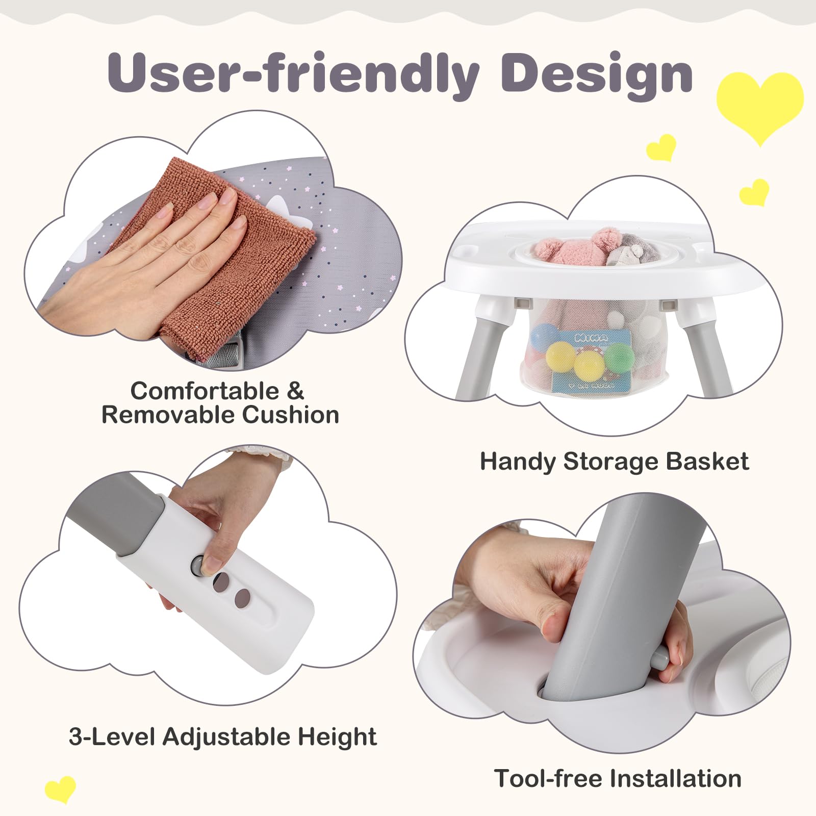 Activity center with 360° swivel & washable seat cushion