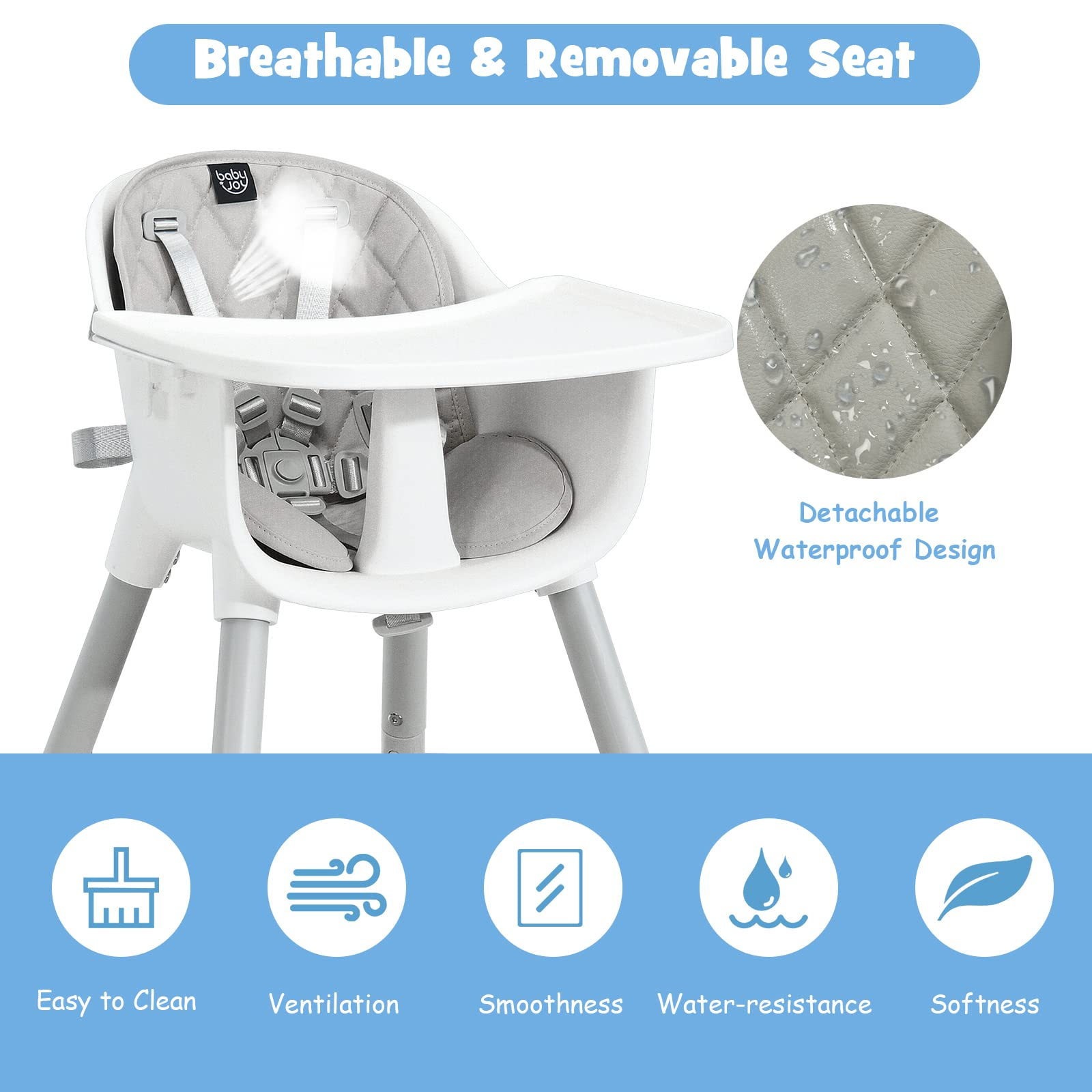 High Quality Material: This baby highchair has four durable legs with steel supporting base at the bottom which enhances the stability while its PU seat cushion is soft, breathable and easy to clean. Besides, the tray is made of kids-friendly PP, which is safe and features great toughness.