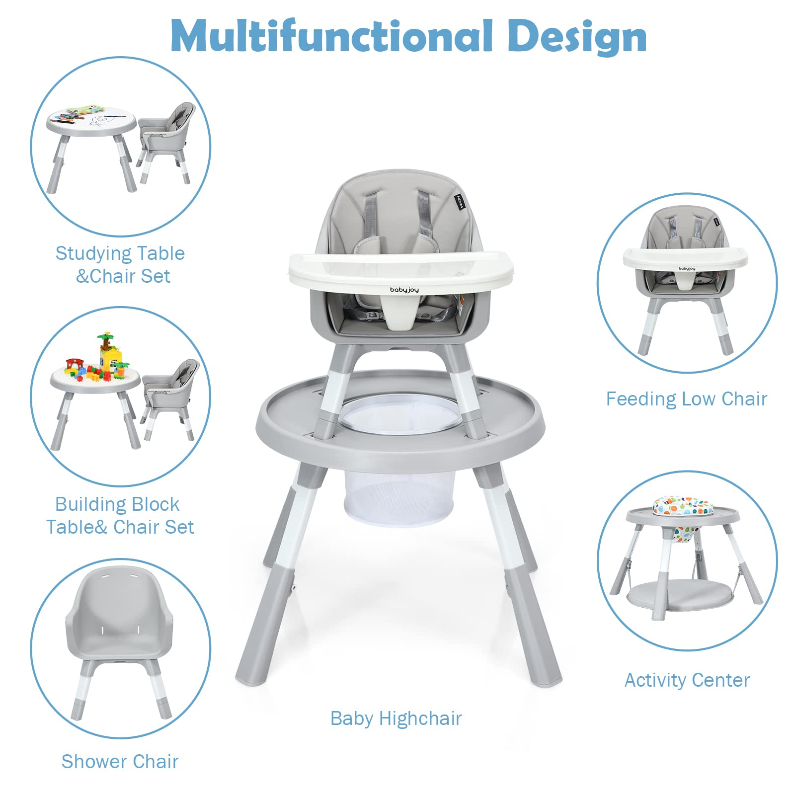 7-in-1 Baby High Chair: This multifunctional highchair can be easily converted into various modes: full size baby high chair, small dining chair, toddler chair with padded cushion, universal kids chair, kids table and chair set, building block table and chair, baby bouncer/activity center. to meet the needs of different ages (in all the chair is widely applicable to infants, toddlers and preschoolers).