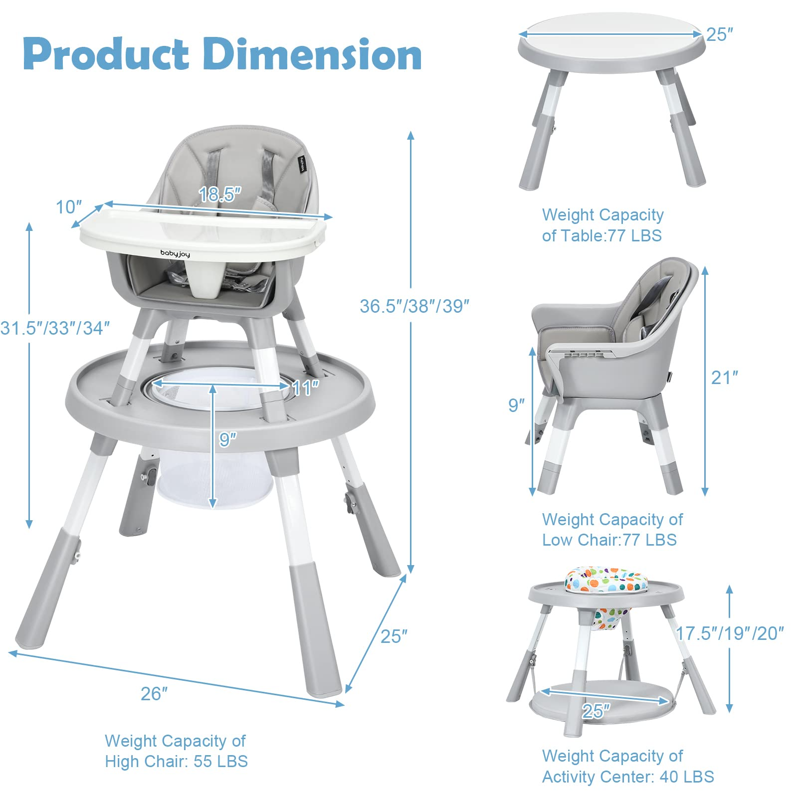 Adjustable Height & Double Tray: The table legs have buttons to achieve 2.5'' extension so that you can adjust the table’s height to 17.5'', 19'', 20''and the overall height to 36.5'', 38'', 39''. And the tray also has 3 adjustable positions to leave a comfortable seating area for your babies, whether they are chubby or not.