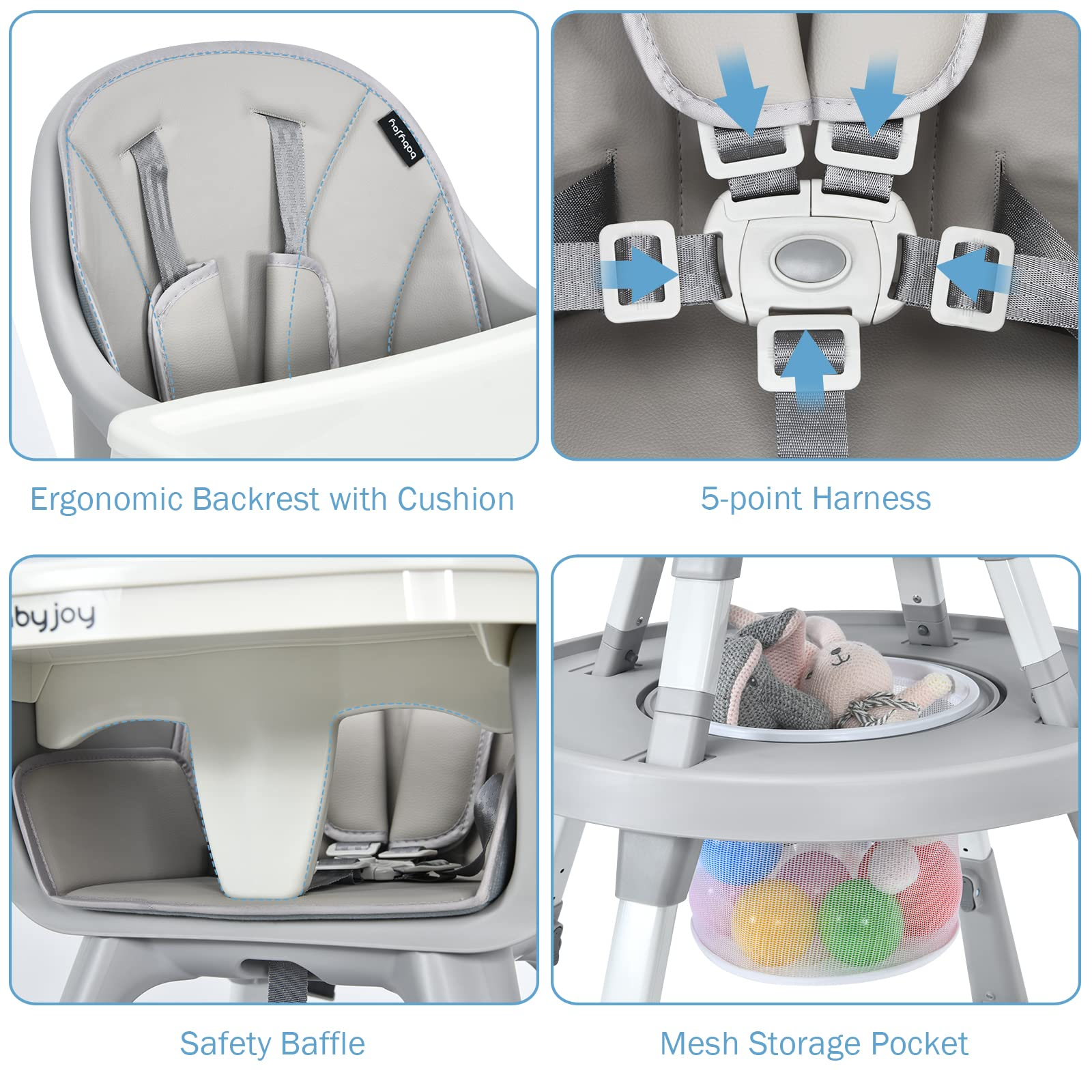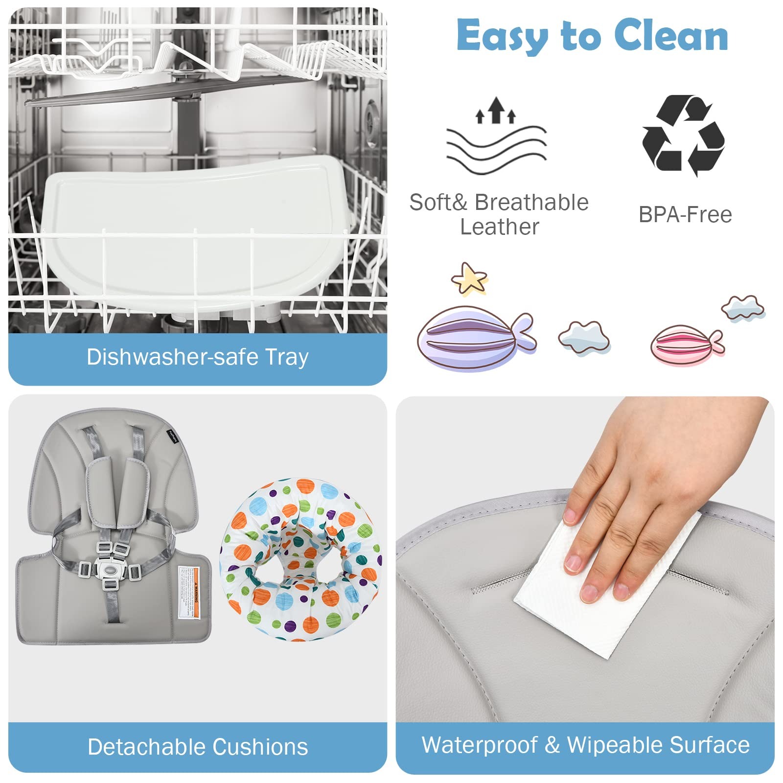 Care for Baby’s Comfort & Safety: This baby feeding chair’s seat is covered with comfortable PU leather cushion, which is fitted with 5-point harness to ensure baby’s safety. Besides, there is a baffle that prevents the baby from standing up or sliding down. And the whole chair is in a stable pyramid structure, with anti-slip pads to increase stability.