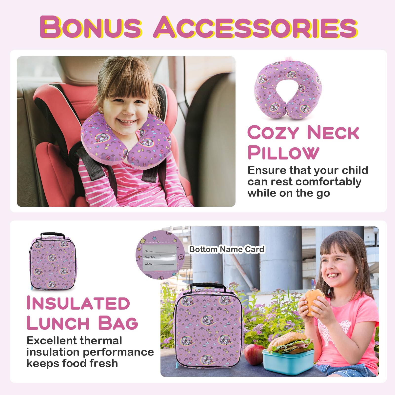 - [ Bonus Accessories ]: Comes with thoughtful extras, the luggage set does a great help to enhance your journey. The cozy neck pillow ensures your child to rest comfortably while on the go and a luggage tag for quick identification in busy terminals or schools. Plus, an insulated lunch bag is useful to keep food fresh and easily accessible.