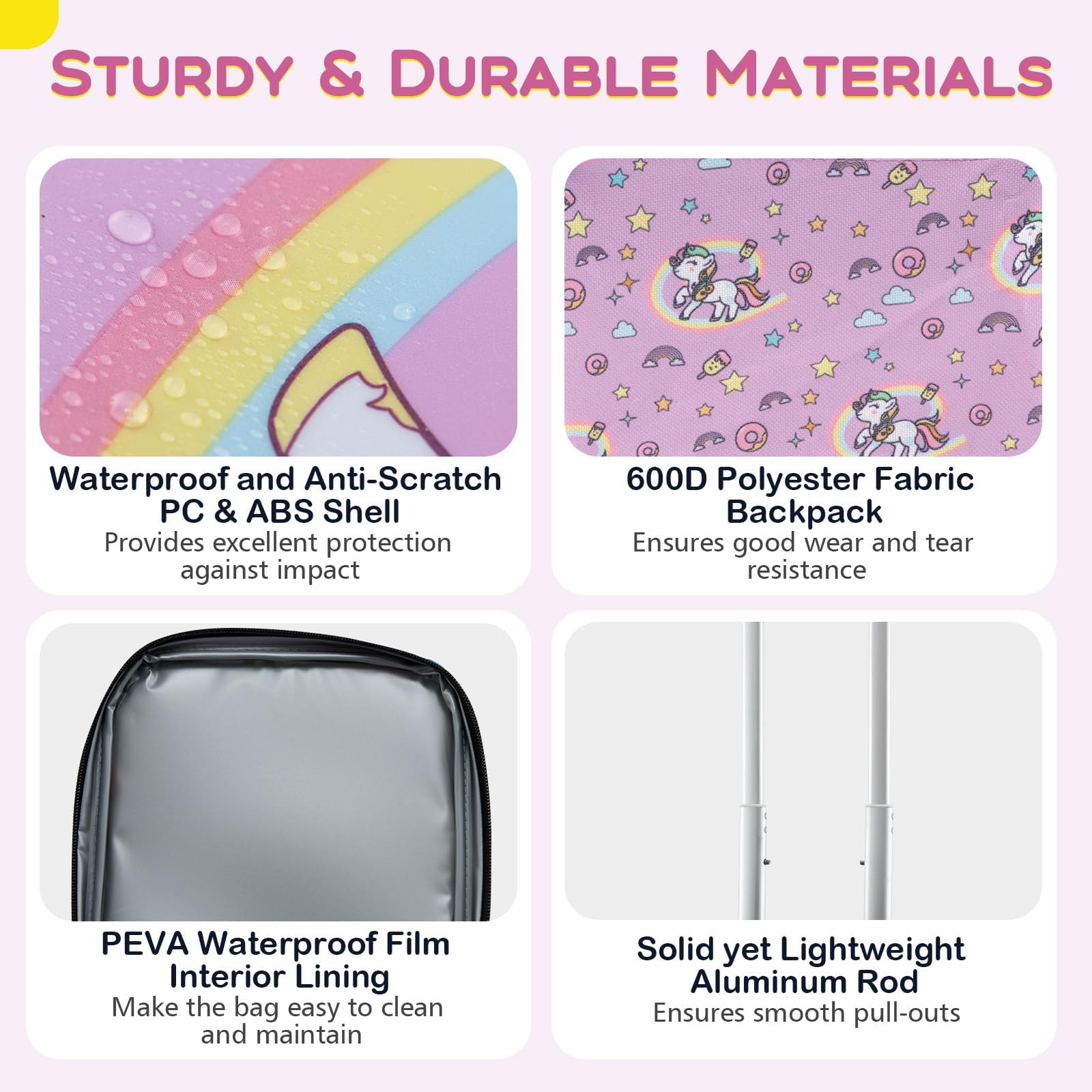 Our 5-piece kid's luggage set includes a vibrant 16" kids carry-on suitcase, a coordinating 13" premium backpack, a soft neck pillow, an insulated lunch bag and a luggage tag. Crafted of durable PC and ABS suitcase and 600D polyester fabric backpack, this set provides excellent protection against impact and outdoor elements, ensuring long-term use. Besides, with its convenient telescoping handle and smooth rolling casters, moving around airports, train stations or hotel lobbies is a breeze. The vibrant patterns add a touch of fun to each piece, making kids indulge in the whimsical world of travel.