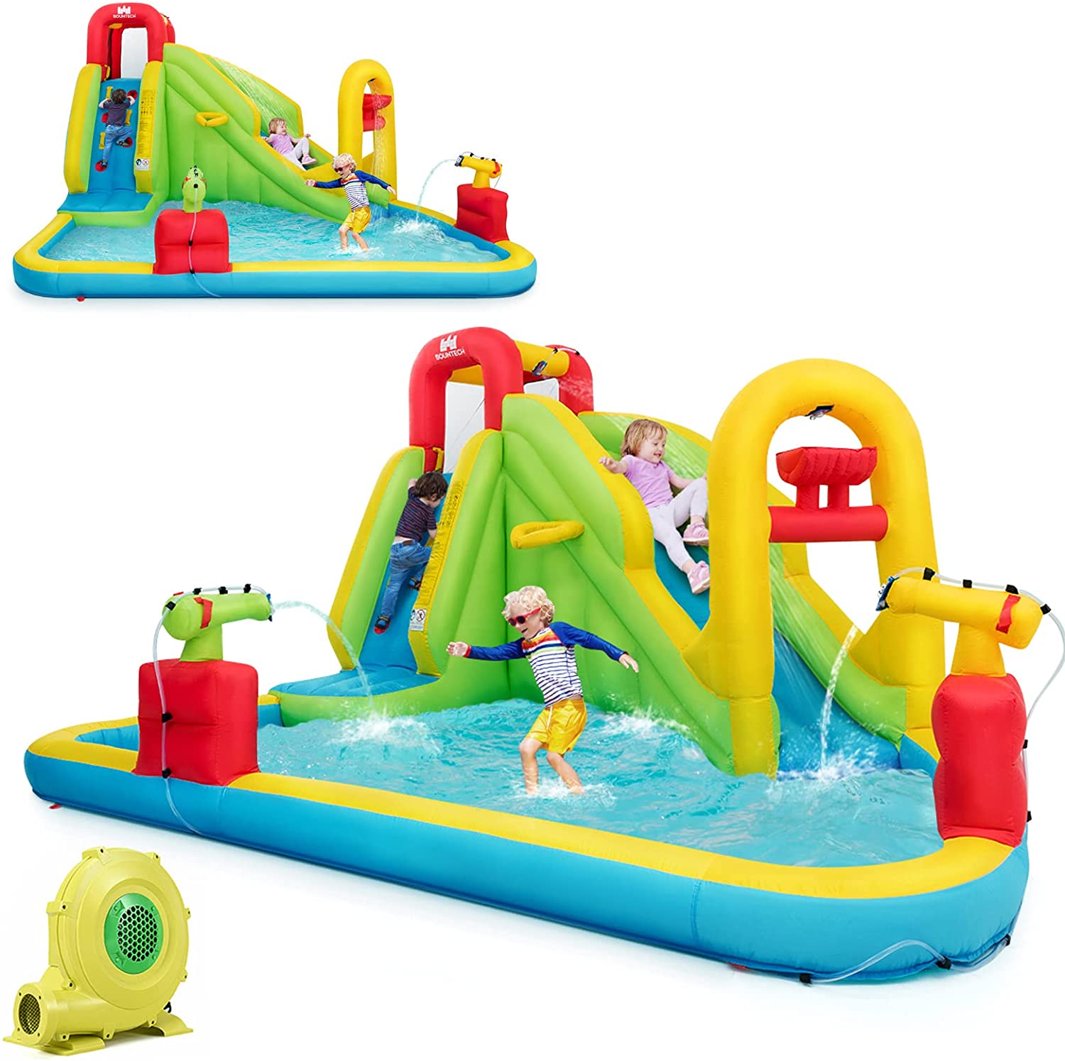 This inflatable water park is a perfect gift for children to spend leisure time. Features a slide, a splash pool, a climbing wall, a built-in basketball rim and two water cannons, children can not only enjoy multiple pleasures, but also exercise their balance. The mesh walls around the connecting area(between climbing wall and slide) ensure the children's safety while playing and satisfies the ventilation requirement well. Come with a hose, the inflatable castle can be used as a water park to make children feel cool even on the hottest summer. Made of wear-resistant oxford materials , it is durable enough to accompany children a long time. In addition, with a carry bag , you can take the inflatable water slide to anywhere you want. Don't hesitate to buy one!