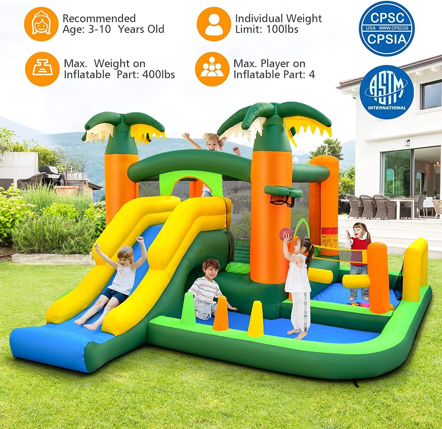 Are you looking for a backyard toy that is perfect for parent-child time? Look at this giant jumping castle of fun! It provides kids with 8 ways to enjoy, having a good time jumping in the bouncy house, climbing onto the slide, whooshing to the ground, and crawling through the tunnel. And the blow-up castle will also arouse kids' interest in multiple sports and challenge their skills to play ring-toss games (rings not included). When they are playing, you can keep an eye on them through the protective mesh walls all the time! And the high-quality Oxford fabric can endure kids' overjumping. Every time they finish playing, just deflate the bouncer, fold it up, and stash it into the carrying bag.