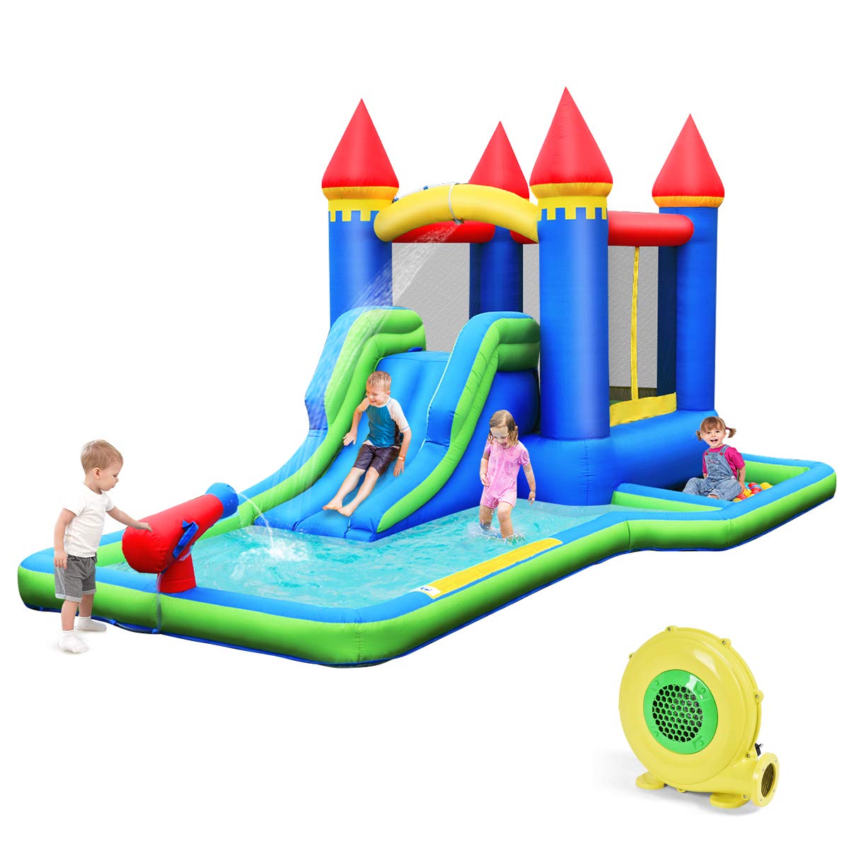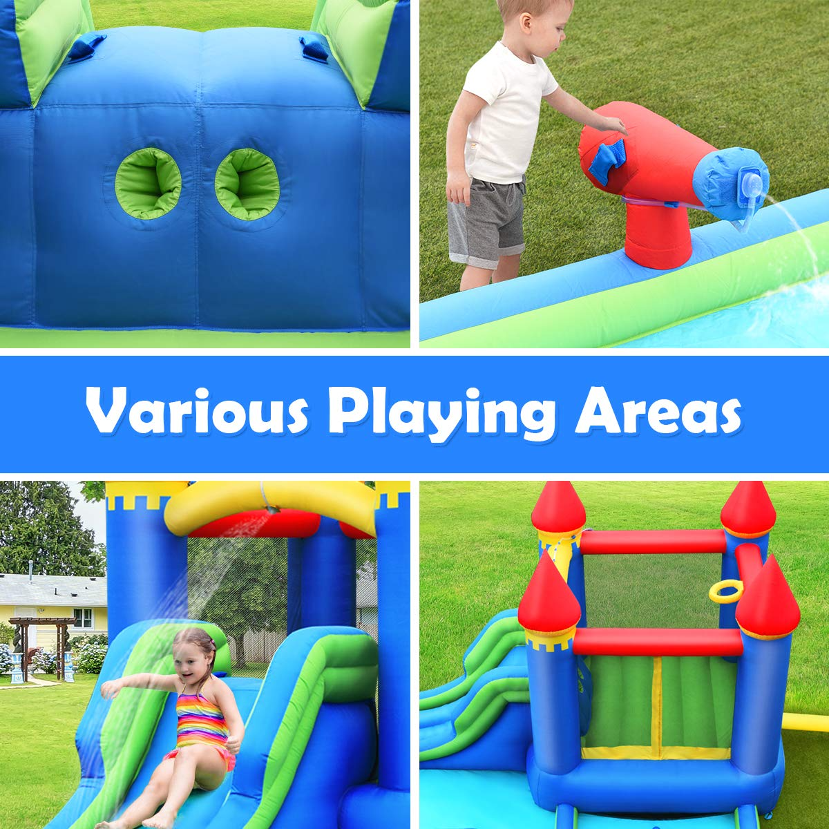 ?Let your kids enjoy spare time to play this cool inflatable water slide park with their friends, bring them a hint of summer coolness and have am enjoyable leisure time. The bounce house is composed of large jumping area, long slide, durable climbing wall, wide splashing pool and ocean ball pit. It combines all playful joy in one. Kids can not only experience sliding through the sprinkling water but also jump as they like.