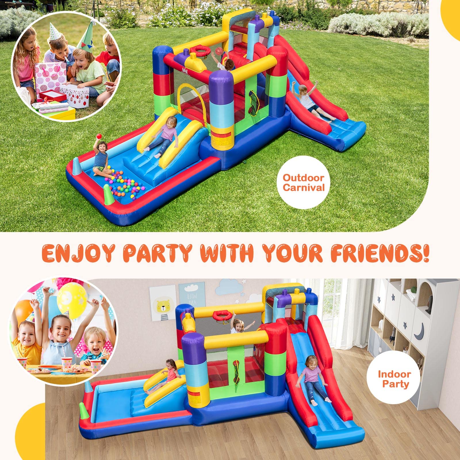 - 【Endless Jumping & Double Sliding Fun】 Let your children jump freely! The indoor outdoor party bounce house is specially designed for your kids to play with friends. Then to the basketball hoop, every jump and shot requires the child to constantly adjust his posture to maintain balance. There are also two inflatable slides at different heights available for kids to play simultaneously which adds extra excitement to this bouncer, they can also go to the ball pit for ring-toss and pitching game.