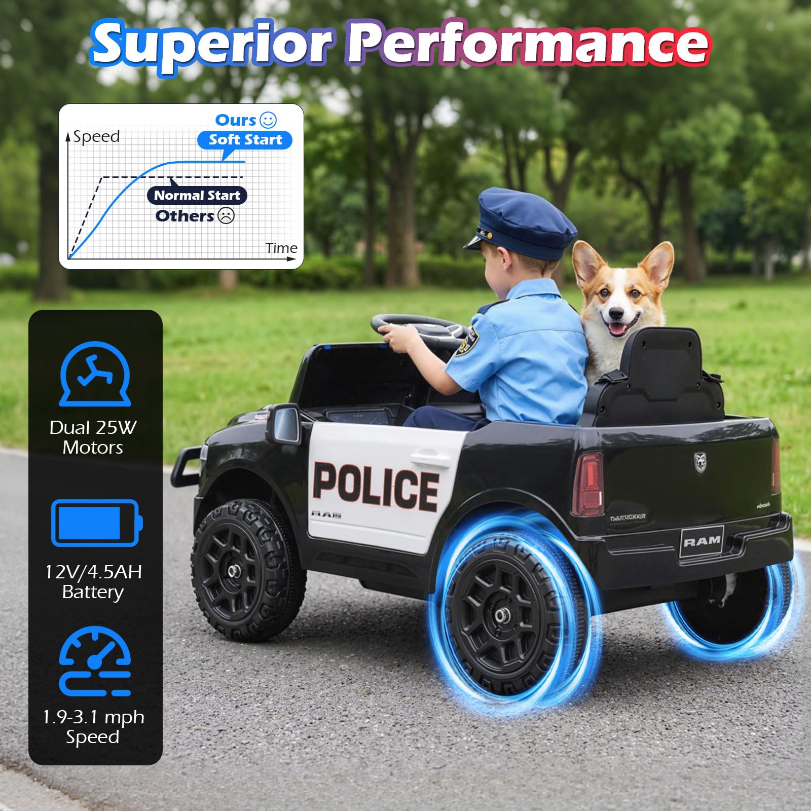 Bright LED headlights and cool police lights to enhance kids' playtime