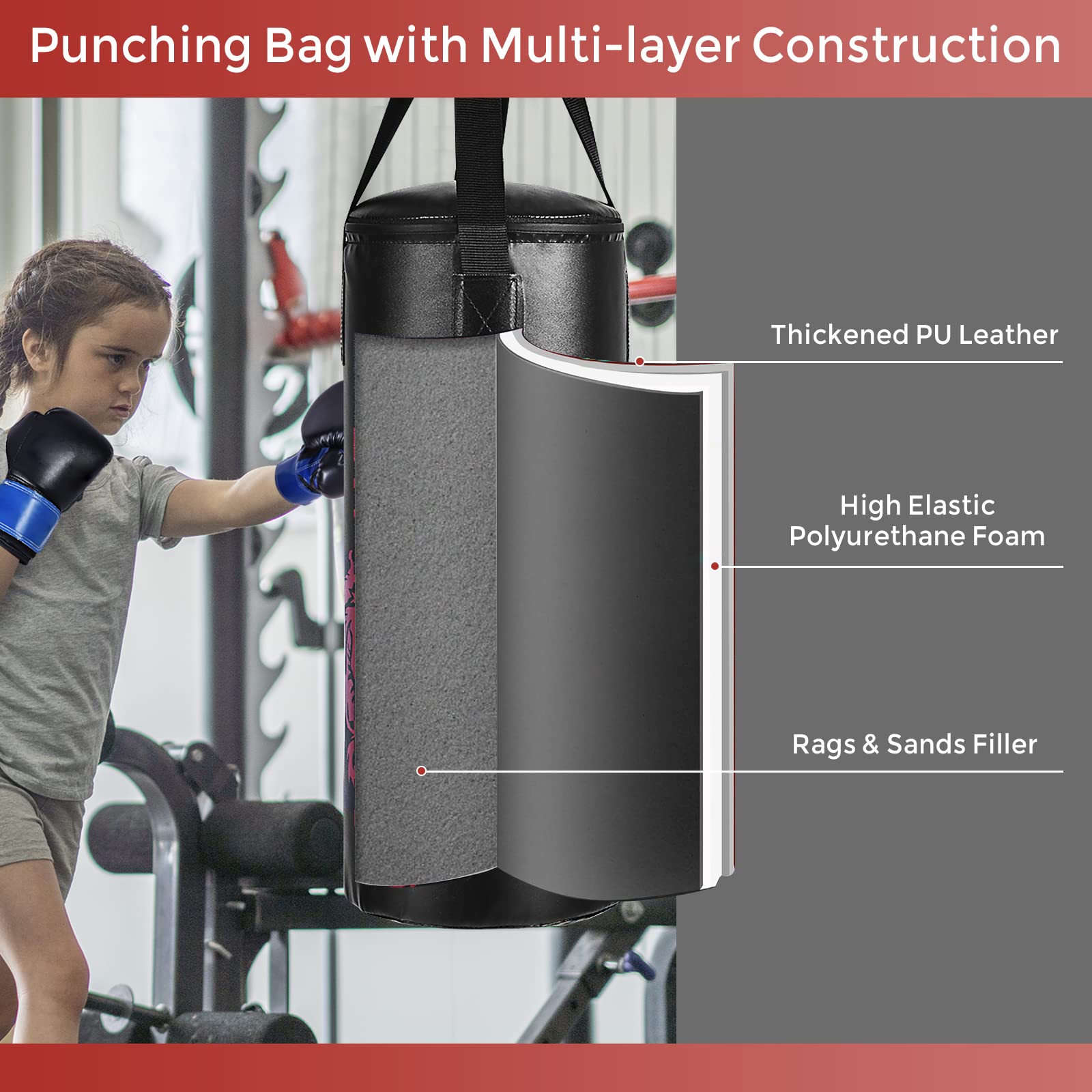 Are you looking for a dream punching bag set for your little one? Our punching bag set comes with a sandbag, boxing gloves, a skipping rope, a carrying bag and mounting brackets. The punching bag is filled with rags and sand for better rebound effect and made of leather to ensure wear resistance. The sponge padded boxing gloves can effectively absorb shock and reduce pressure on the fists. While strengthening physical fitness and coordination, the extra jump rope helps children improve coordination. In addition, the carrying bag brings much convenience to transport the punching bag set.