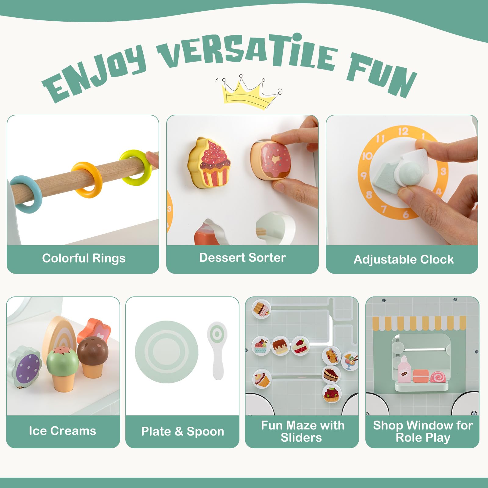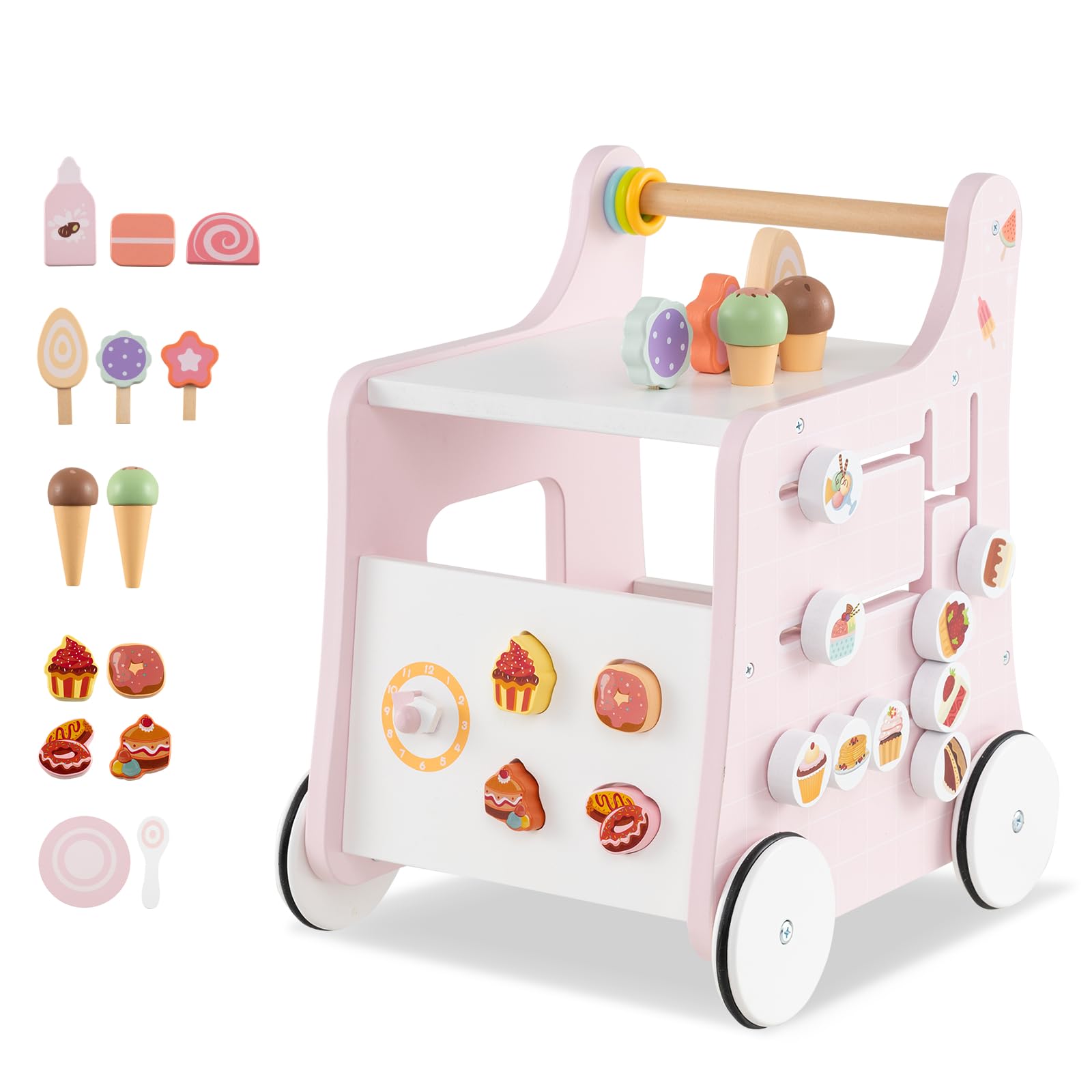 The multi-functional walker provides your toddler with vibrant fun. On its side, a lively shop window prompts imaginative role-play. Designed with safety in mind, the baby walker features smooth rounded edges and reliable MDF material. The large wheels are padded with rubber, which is anti-slip and noise-free. And the cozy wood handle is easy to grip. Beneath the play surface lies a spacious storage area, perfect for organizing toys. Ideal for children aged 1+ years old, this kids activity center with kids-friendly details nurtures creativity, imagination, motor skills, and hand-eye coordination, ensuring it becomes a cherished companion in your child’s early years.