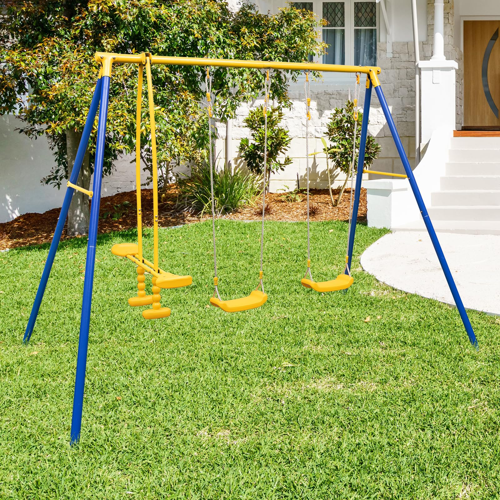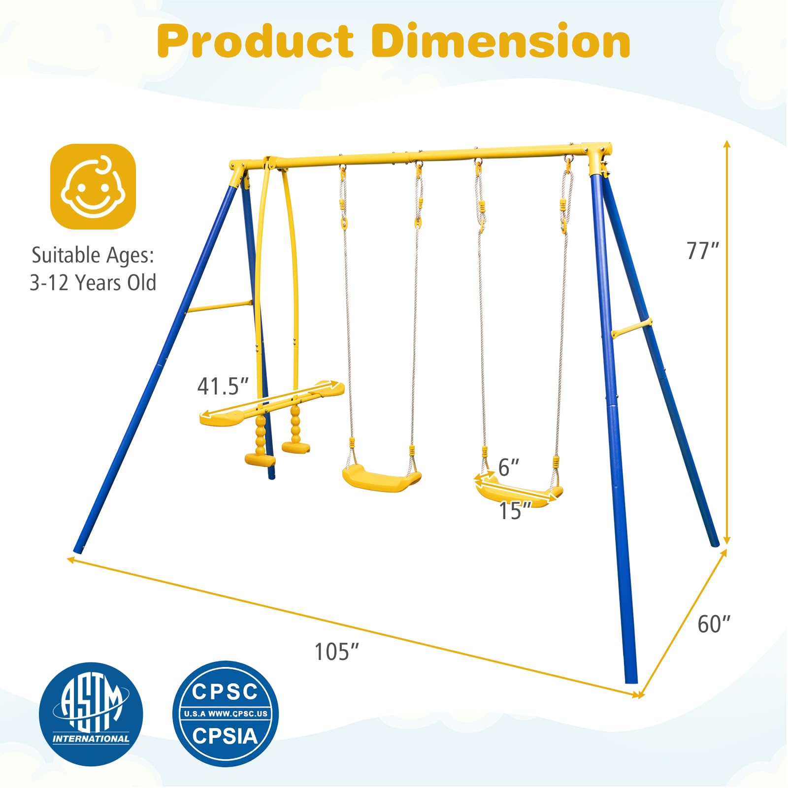 - 【Fun Experience All Year Round】 A Big Surprise for Kids! This versatile swing set adds much fun to kids' playtime and is an ideal zone for them to enjoy different game experience. Moreover, there is no limit of seasons and places, the swing set is suitable for diverse occasions, such as backyard, garden, park, and playground, etc.