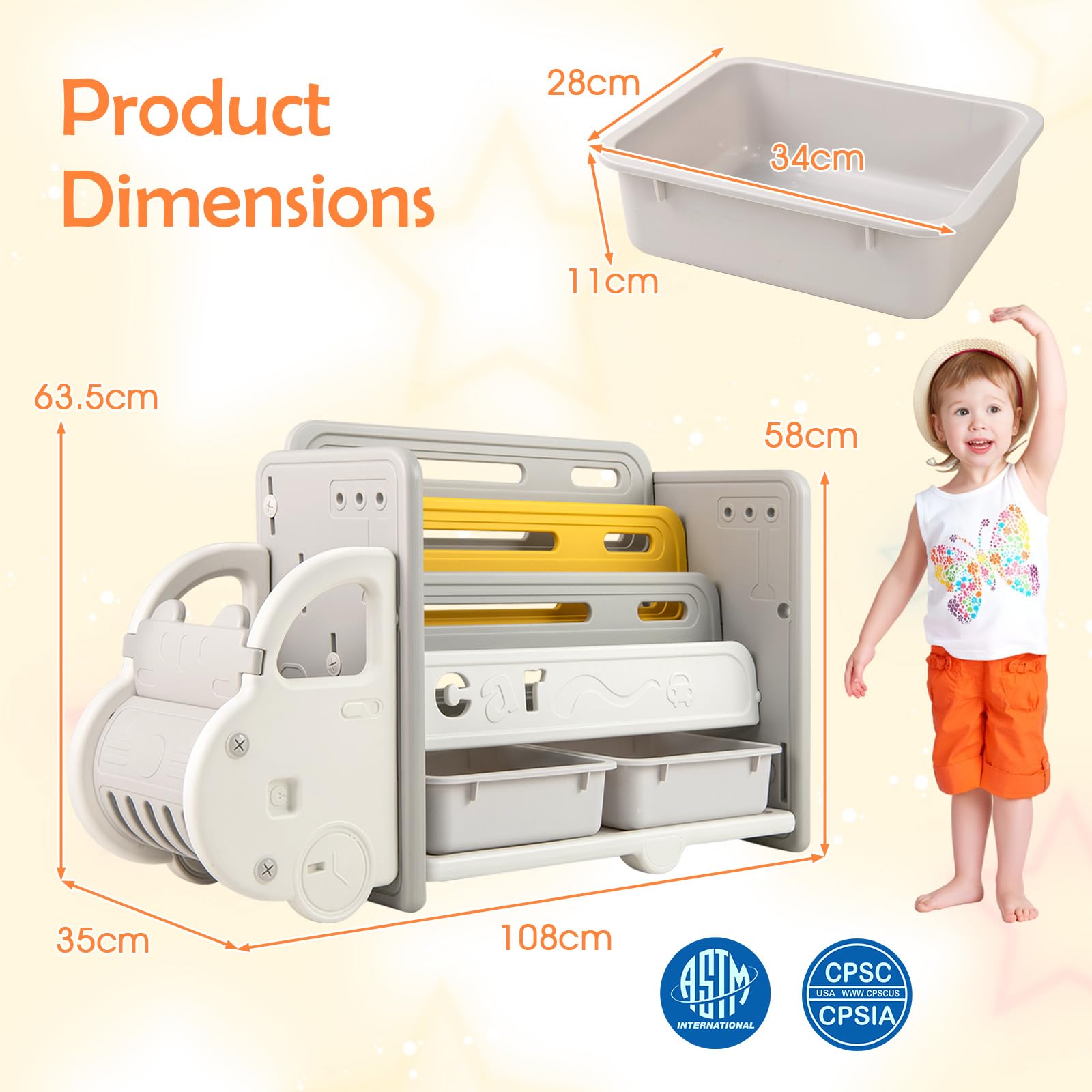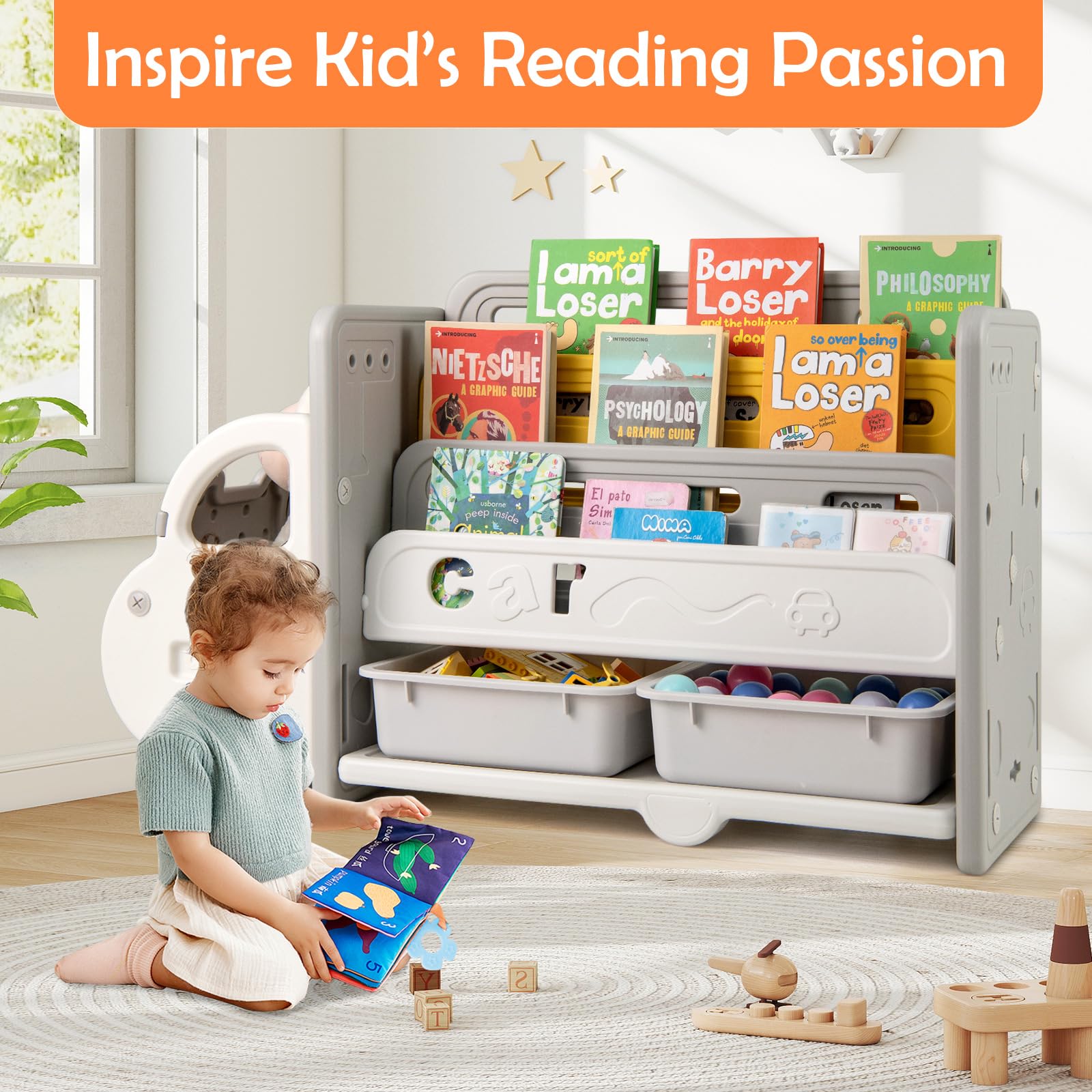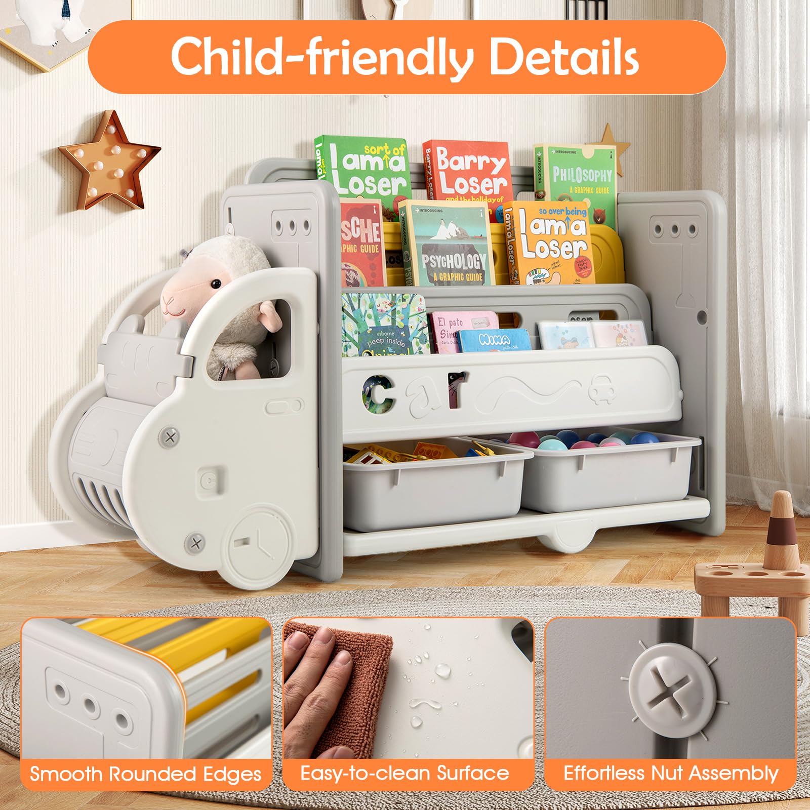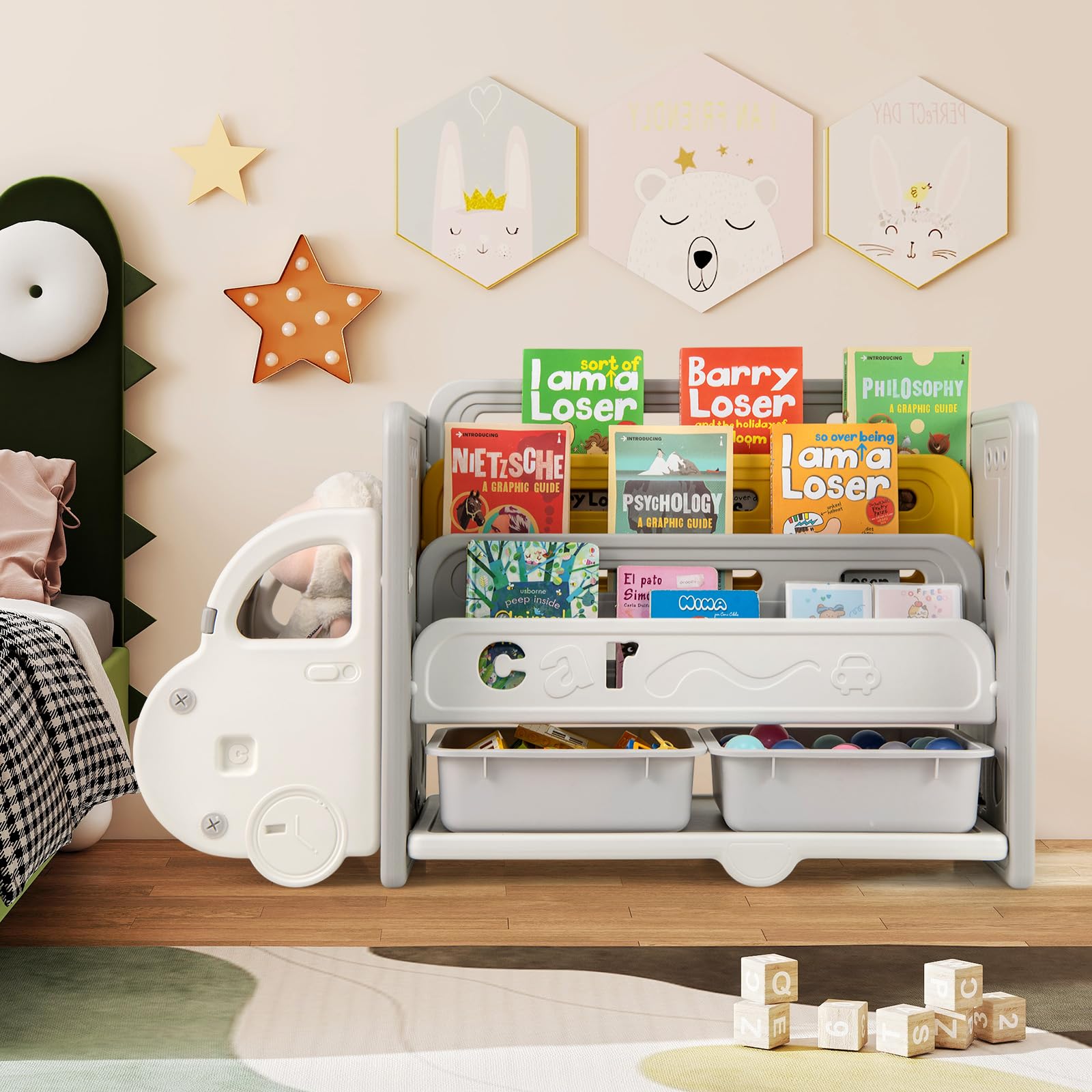 Boasting 3-tier bookshelf, 2 storage boxes and car head storage, the bookshelf will cultivate kid's good organizing habits by classifying books and toys. With scientifically designed height of 25", children can reach their desired items without the help of parents. And smooth edges ensure that children won't be scratched during use. Made of HDPE and PP materials, the book rack is built to last. Car-shaped style makes the toy and book storage organizer a captivating centerpiece in any child's room, igniting children's passion for reading and imaginative play.