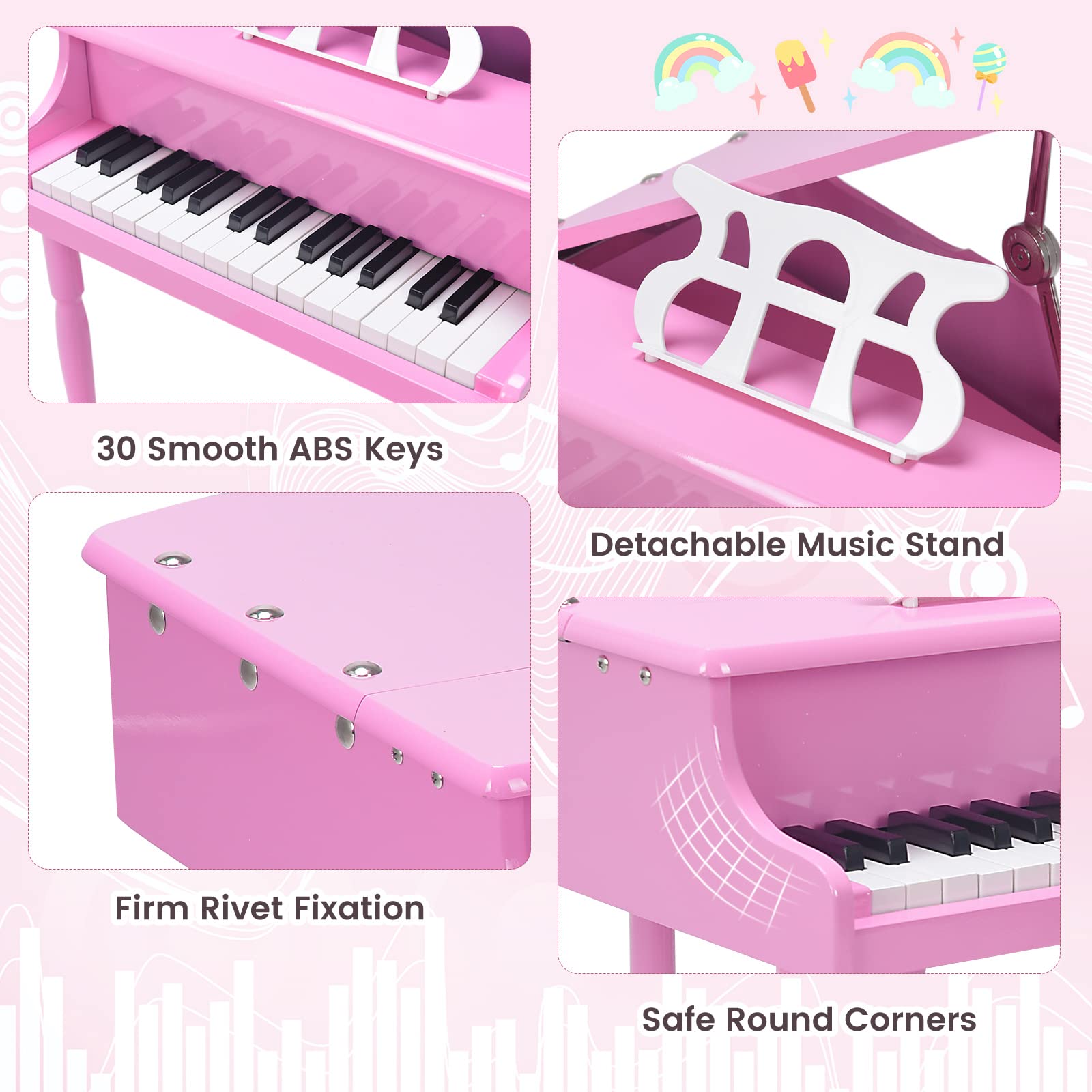 - Kids-friendly Curved Angle & Smooth Surface: Piano body with kids-friendly round corners and side-cutting stool corners avoid accidental collision or injury of children, which can protect kids better. Piano and bench surfaces are smooth and glossy and will not harm children's skin while cleaning easily with a soft cloth.