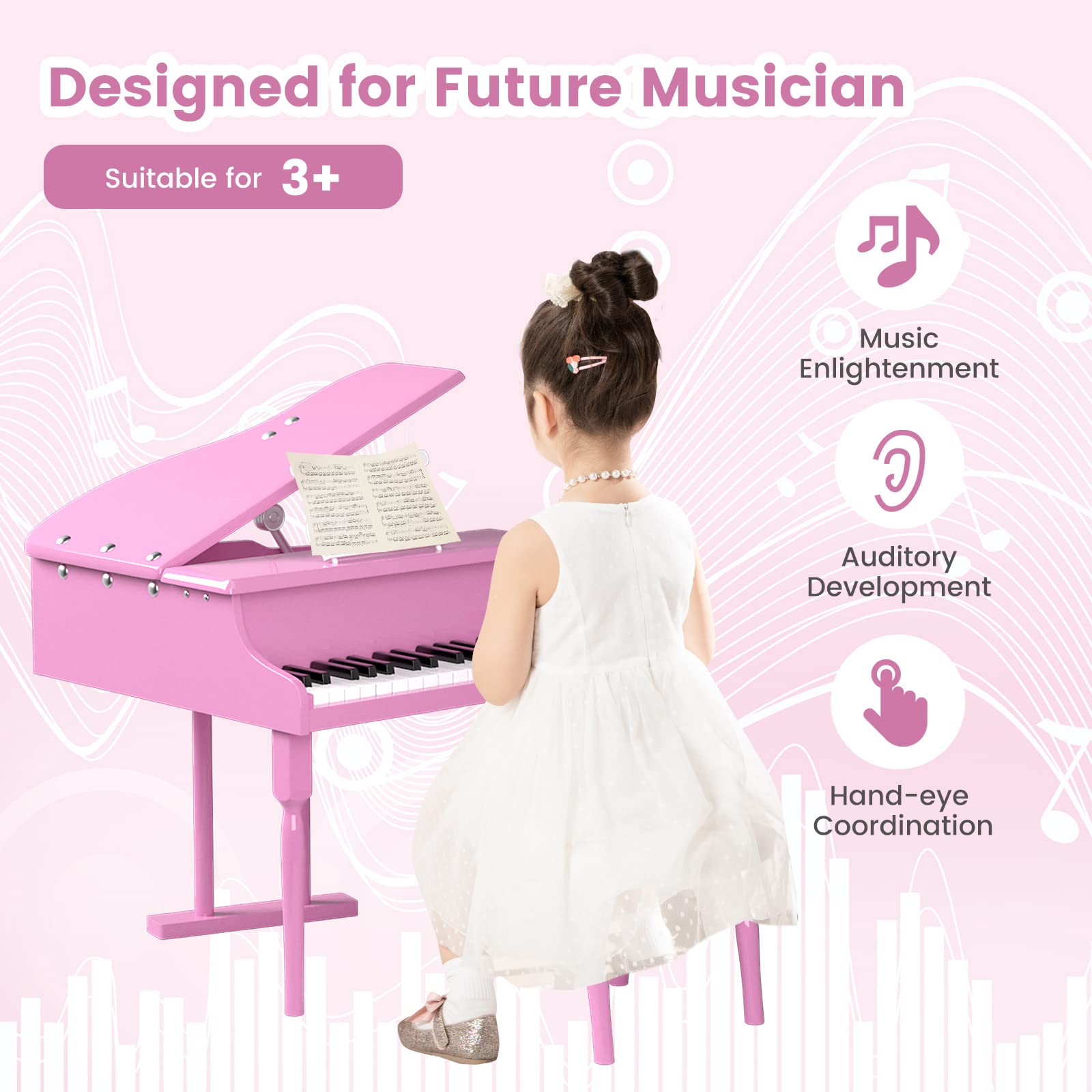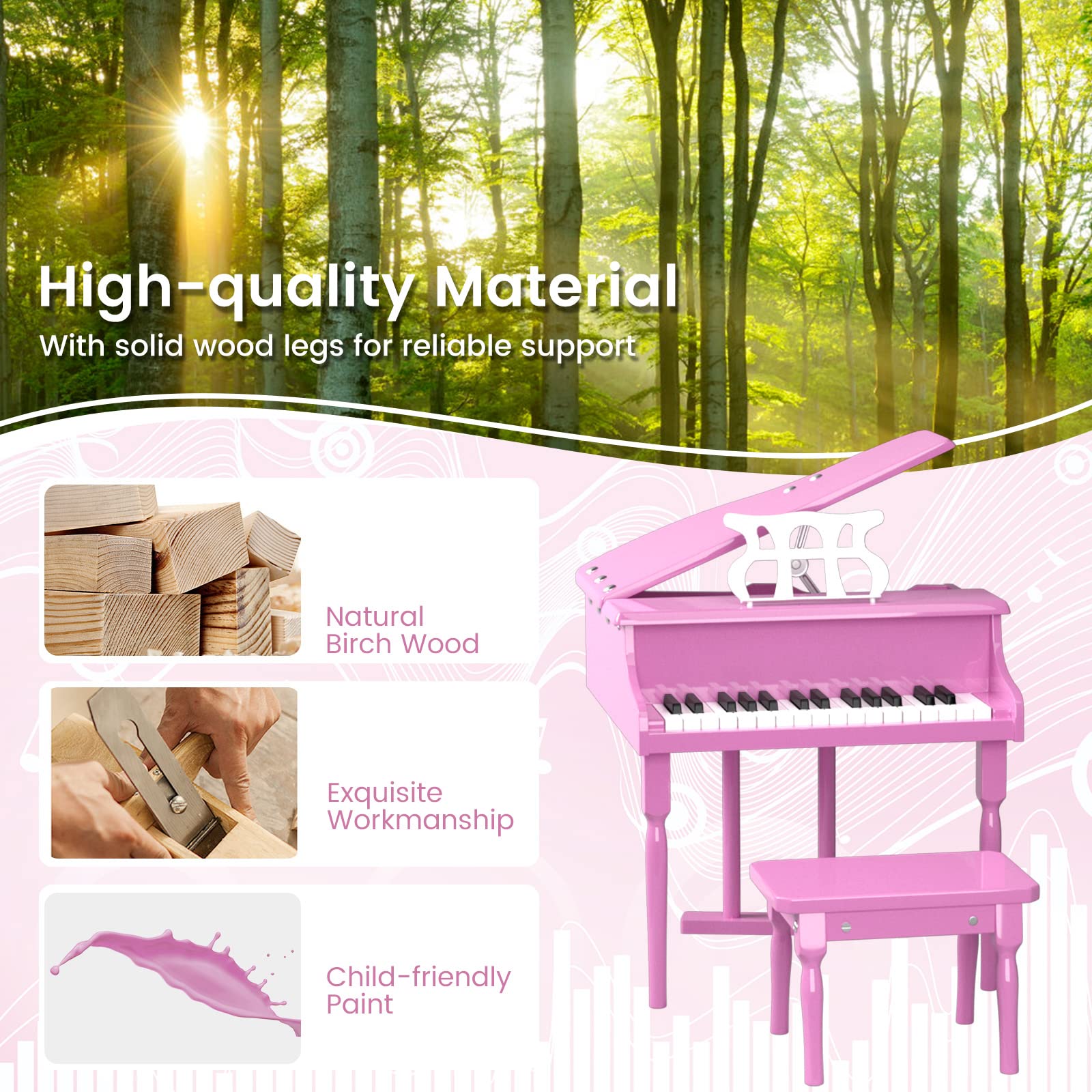 - Sturdy and Environment-friendly Materials: The children's piano has an MDF body with birch legs and ABS keys, which are sturdy and durable for a long lifespan. The piano's surface is coated with environmentally friendly children's paint with TSCA certification that is safe to accompany the healthy growth of children.