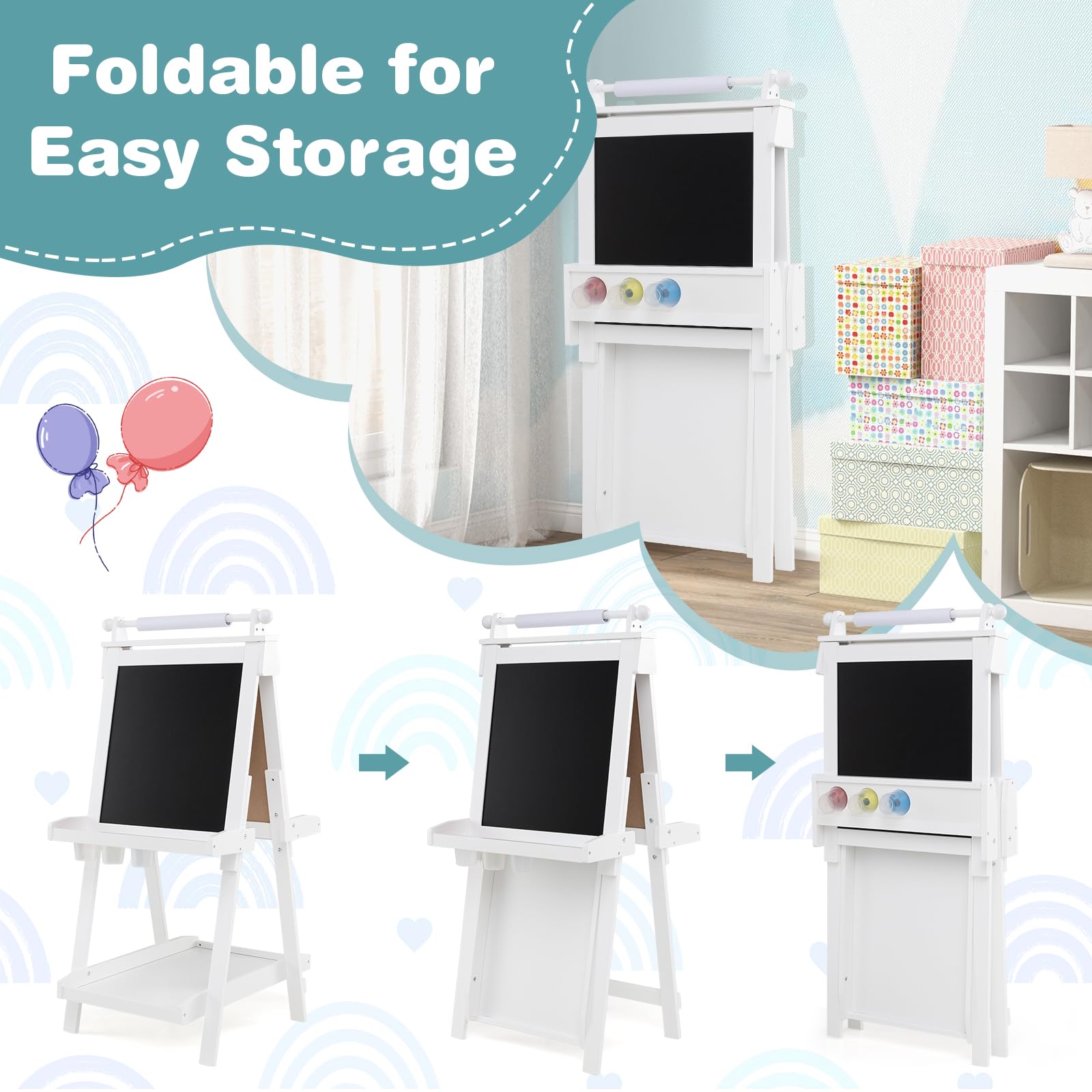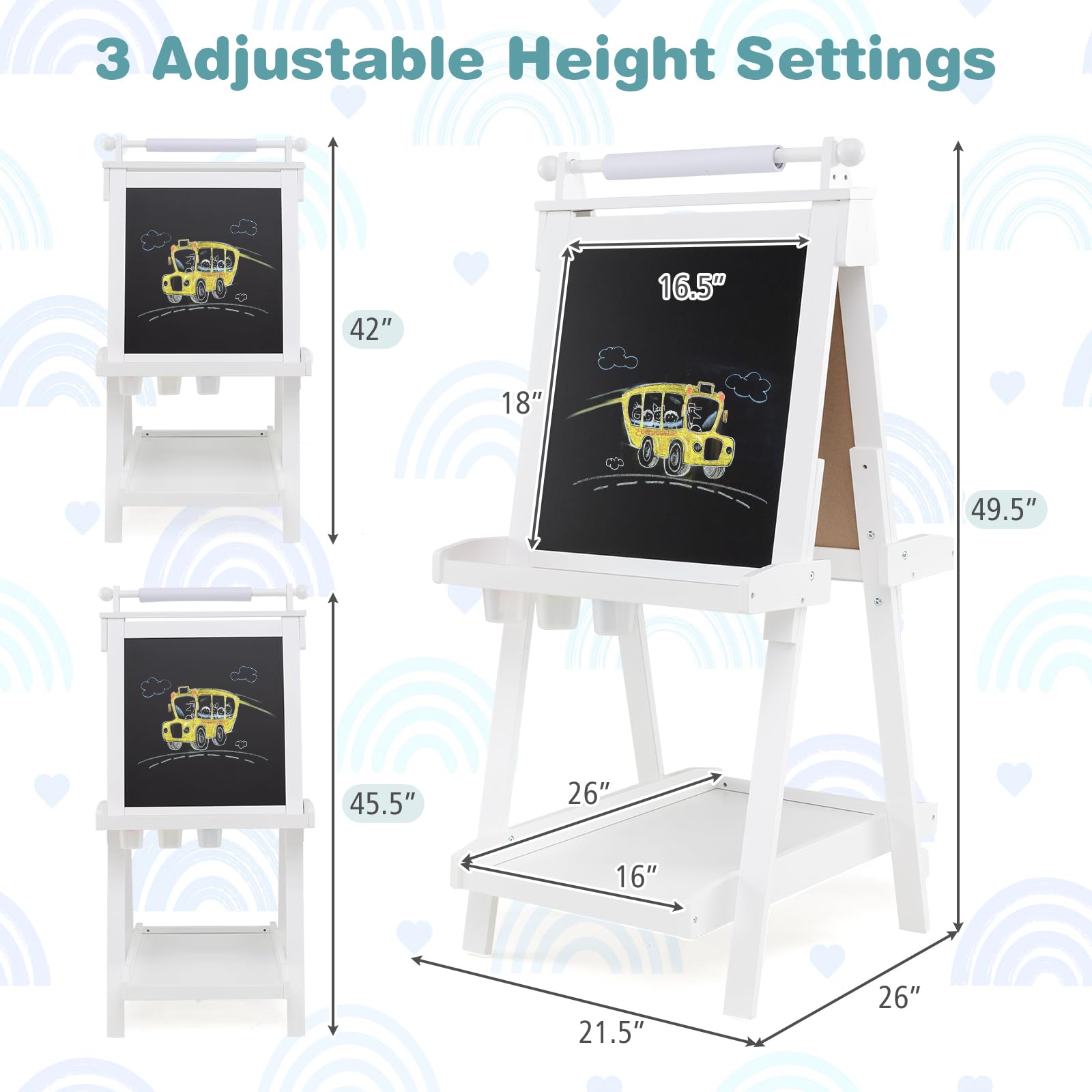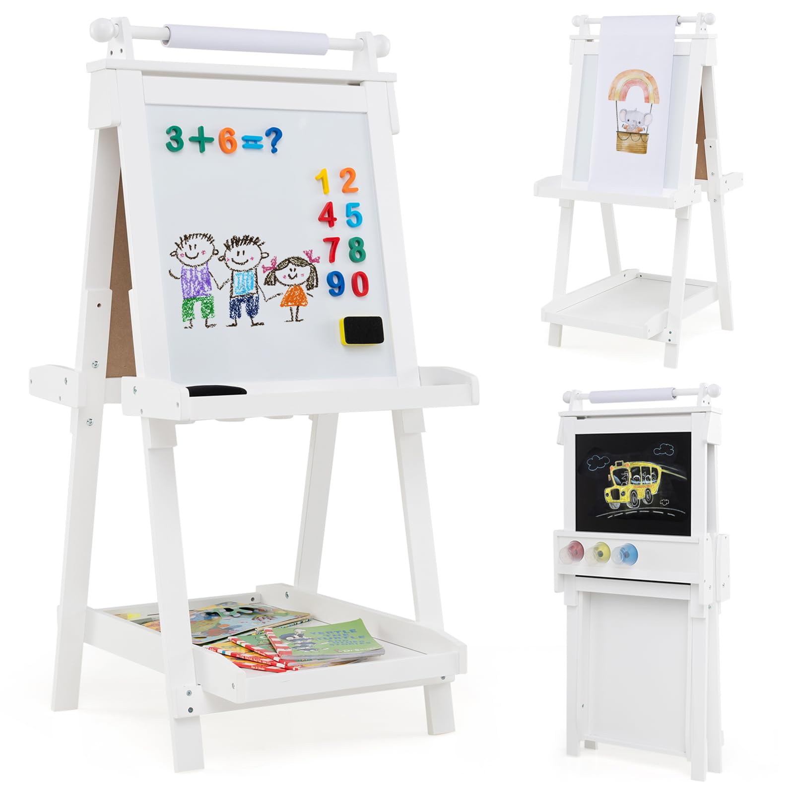 Looking for the perfect gift for your little artist-to-be? Our kids’ art easel is just what you need! This 3-in-1 painting stand lets children effortlessly switch between a chalkboard, whiteboard, and painting paper, so the creativity never stops. With 3 adjustable height settings, it grows with your child, while the foldable frame tucks neatly into any corner for easy storage. Keep everything organized with 3 storage trays and 3 paint cups, perfect for holding markers, chalk, and paints. Designed with an A-frame construction and smooth rounded edges, it’s both stable and safe for your budding artist. Let their imagination run wild with our versatile 3-in-1 kids’ art easel!