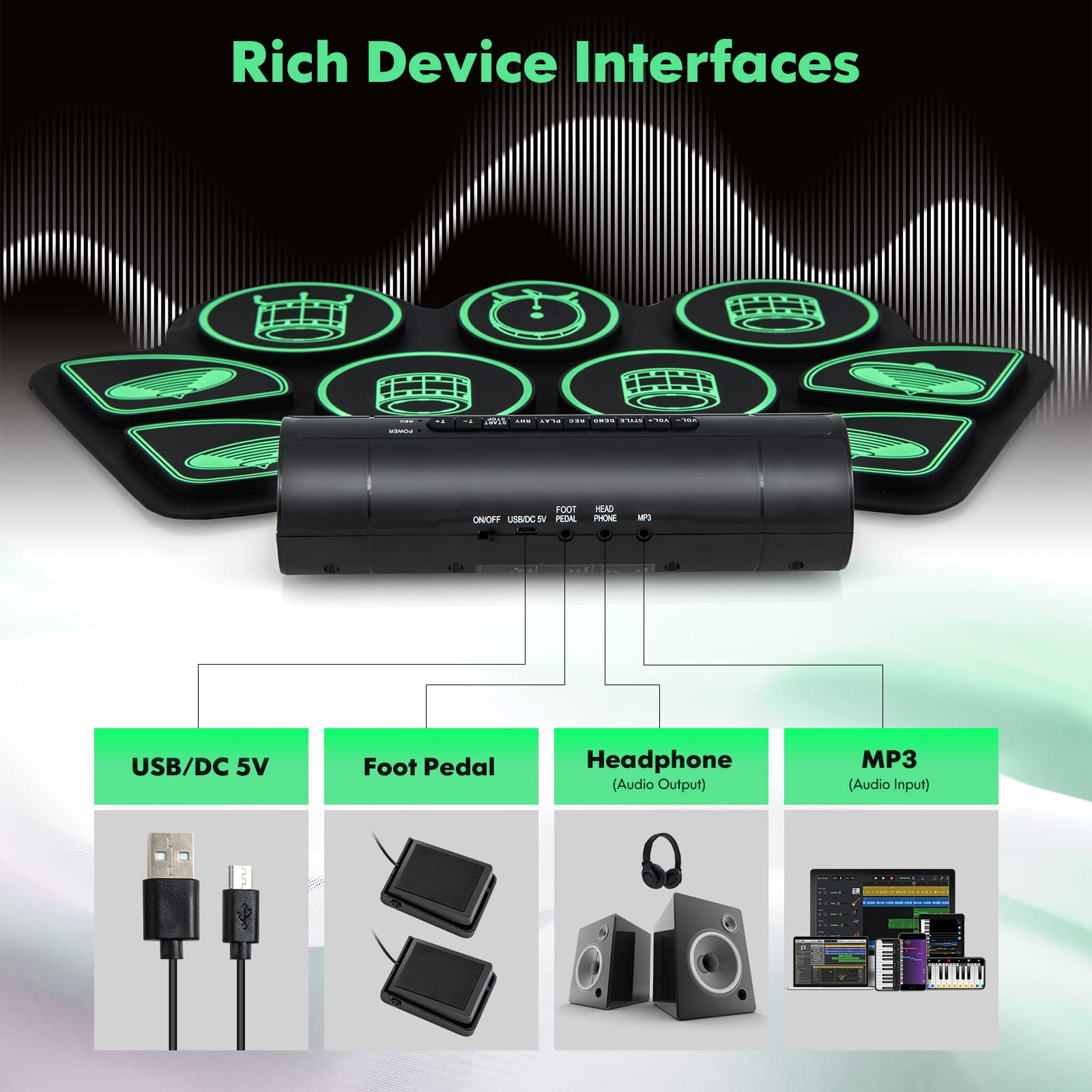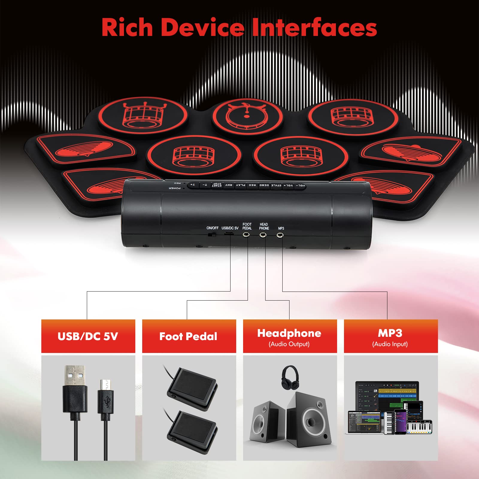 The 9-pad drum kit features 7 drum sounds that accurately restores the sound of acoustic drums. The included sticks and foot pedals give you a real feel of kicking and pedaling a professional drum kit. 4 demo songs, 9 accompaniments and 15-level adjustable playing speeds are designed to meet your practice needs. Wearing headphones, you can enjoy the music quietly and privately. If you want to showcase your creative music, the dual stereo speakers will present warm, rich and loud sounds. You can adjust the volume to 9 levels freely. The MIDI and recording/play function allows you to edit, record and appreciate your own music. Moreover, the lightweight and soft silicone material makes the drum pad easy to roll up for space-saving storage and great portability. Just plug in or connect to your power bank, and then start drumming!