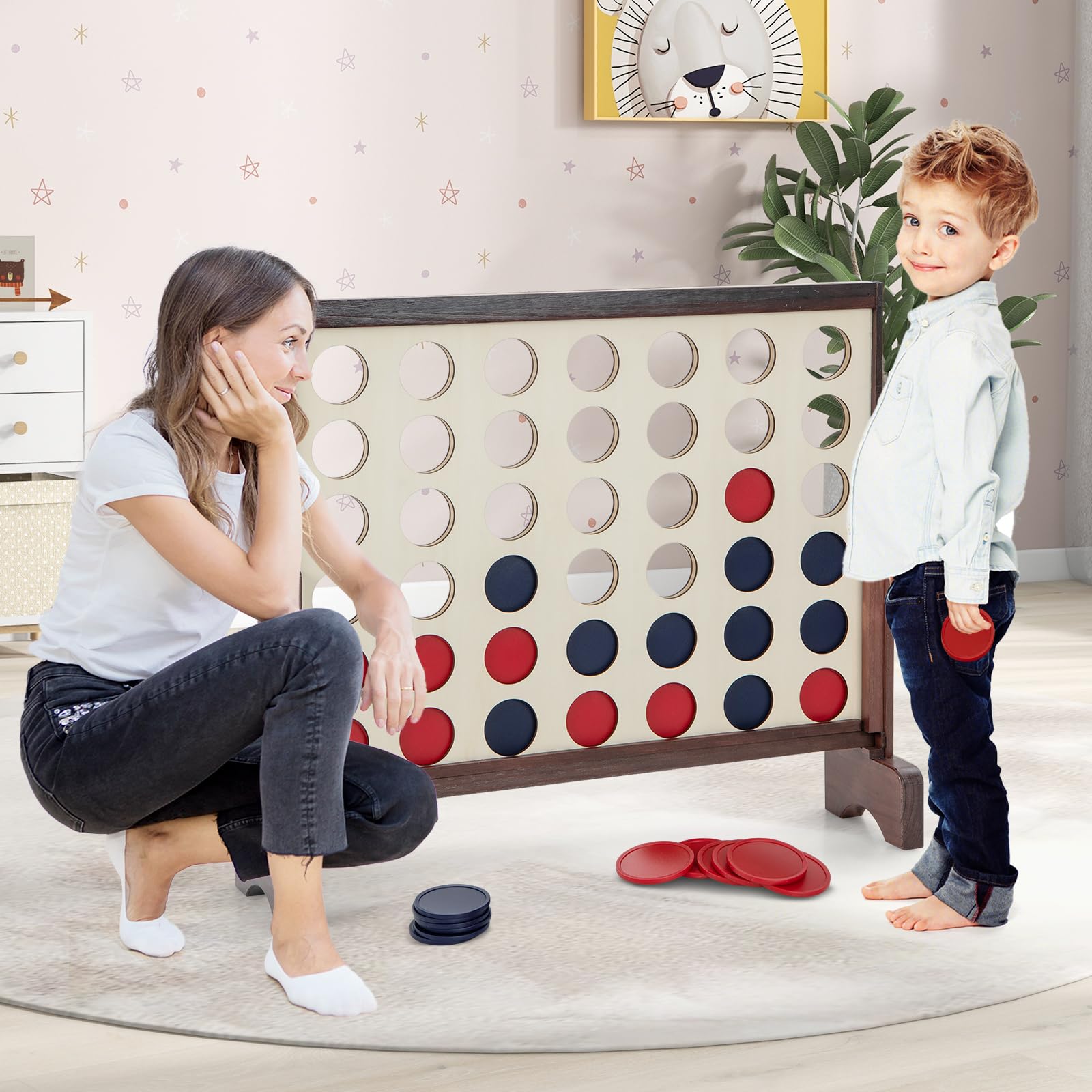 This giant 4-in-a-row game set features a game board made of plywood and legs crafted from pine wood for long-lasting use. Besides, there are 42 chips for easy play. The carrying bag makes transport and storage easier. Setting up the game is simple and here are steps. 1) Unbox all parts. 2) Place the legs in parallel. 3) Insert the game board. 4) Put in the release lever. 5) Start an exciting game. And you will win if your 4 chips are in a horizontal, vertical or diagonal row. The giant connect 4 game is great for kids and adults to promote their brain development. Suitable for both indoor and outdoor use, this line-up-4 game is great for parties, gatherings, camping, etc.