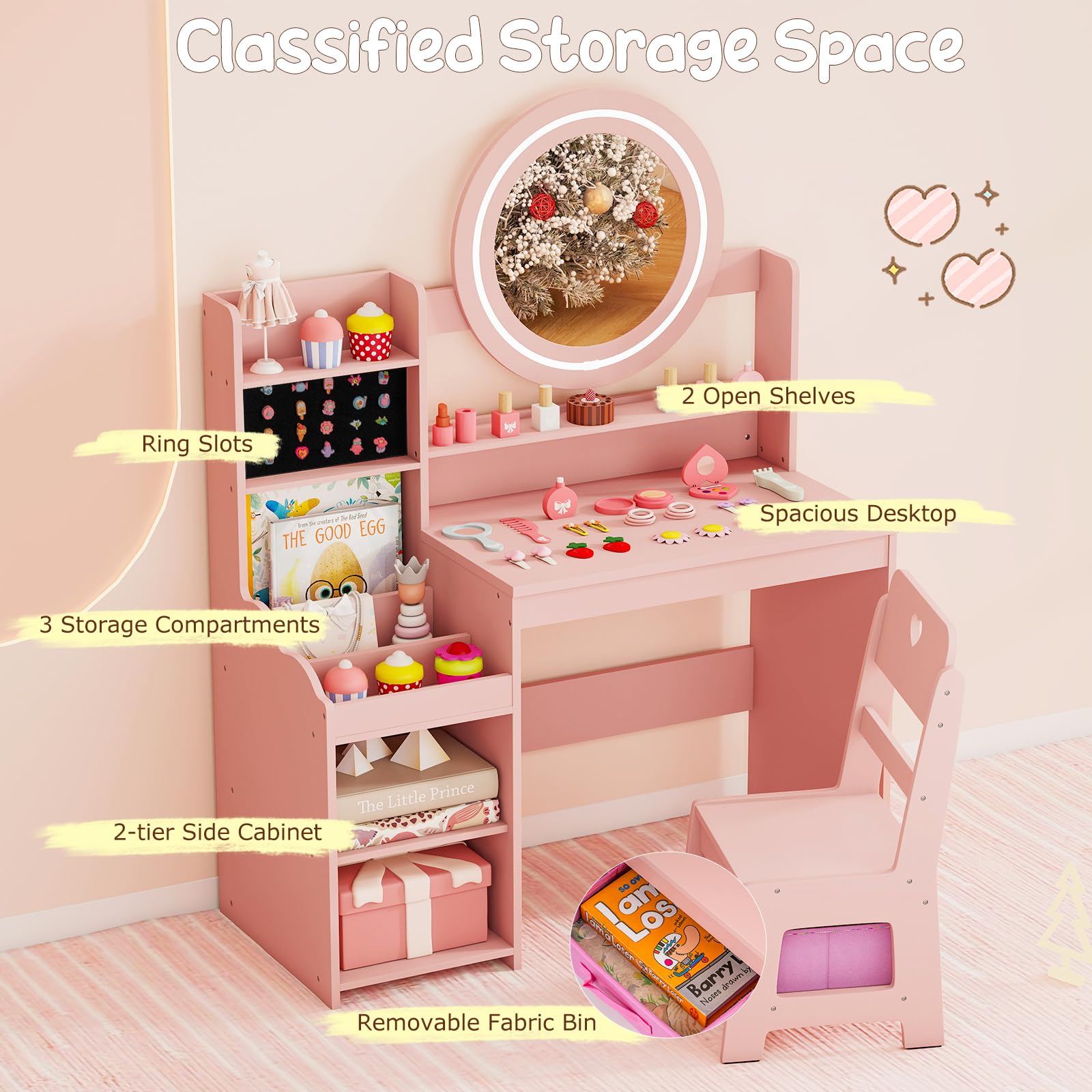 Featuring built-in lights, this kids vanity desk provides just the right illumination for makeup play, getting ready, or imaginative activities. Thoughtfully designed, this children’s dressing table offers 2 open shelves, ring slots, 3 compartments, a 2-tier side cabinet, and a removable fabric bin—helping kids learn tidy habits. A shatterproof acrylic mirror and an anti-toppling device add extra peace of mind. Perfect for reading, drawing, and dress-up, this multifunctional vanity set for children brings charm to bedrooms or playrooms.