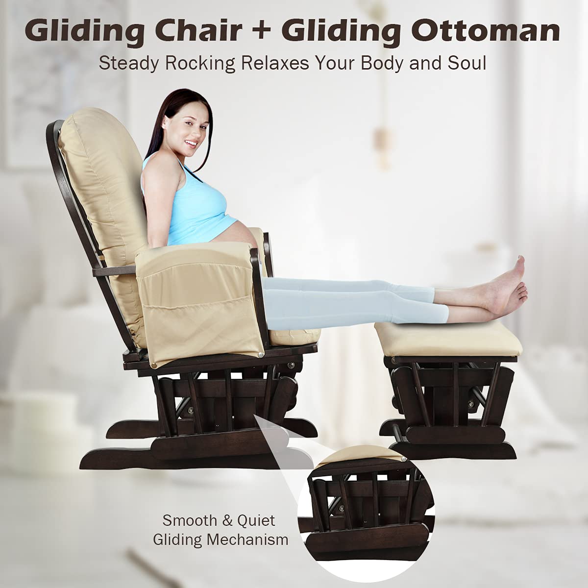 - Smooth & Quiet Gliding: Our rocking chair set is designed with a glider base, which has been exquisitely crafted and conformed to dynamics for smooth and gentle rocking without excessive forward or backward. Also, there is no noise when you are rocking, ensuring a peaceful rest moment.