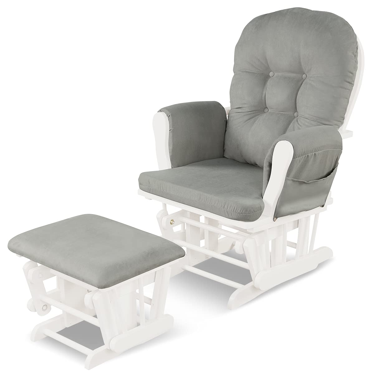 Rest on this rocking chair and enjoy the peaceful moment! The rocking chair is designed with an advanced glider base, which achieves smooth and gentle rocking for an ultra-comfortable experience. A gliding ottoman is included, giving your legs a support and allowing you to rest in a more comfortable position. Super soft cushion with high-density foam padding and skin-friendly fabric make it a cozy spot for reading, napping, or babysitting. Modern color matching makes this glider and ottoman set a great addition to your home. It is suitable for the living room, bedroom, nursery, and other occasions. It will be an ideal gift for parents or friends.