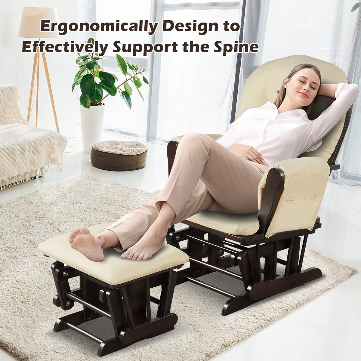 - Sturdy Solid Wood & High Stability: This glider and ottoman set is made of sturdy rubberwood and bentwood with a well-polished surface. It will provide strong support to bear the weight of 396 lbs. The wide feet also increase the overall stability without wobbling or tipping over.
