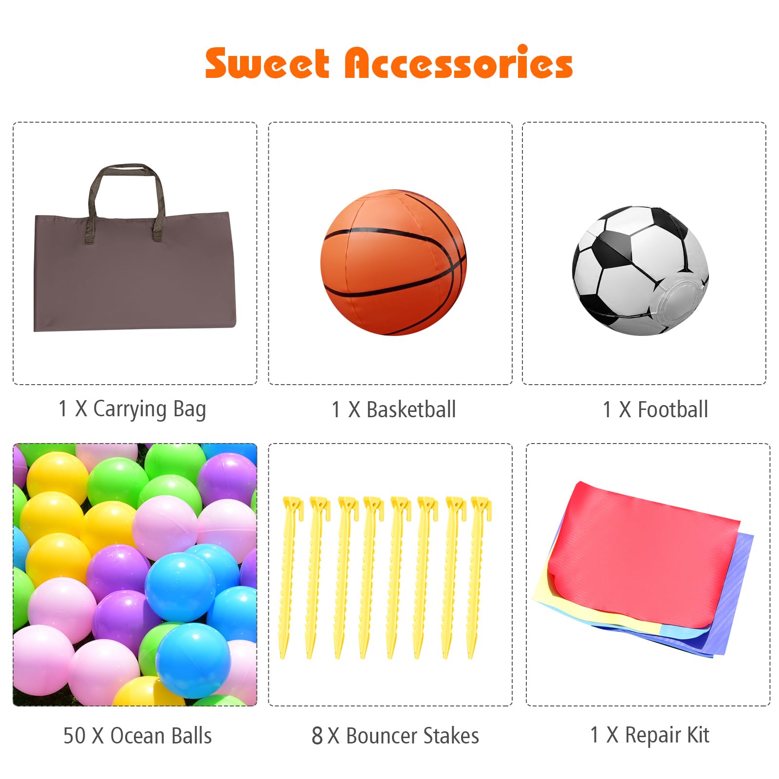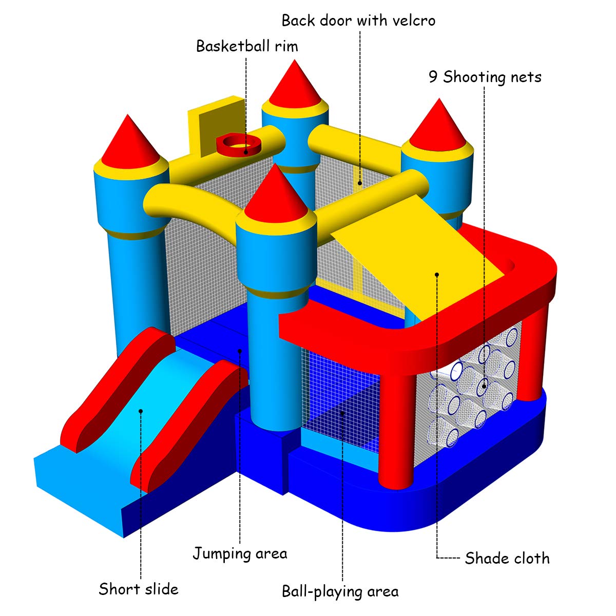 In this charming rocket castle, kids can bounce, play basketball and slide. It features a basketball slam dunk, a fun exit slide, and a shaded side playroom, which will bring much happiness to your children and they can share precious playing time with their friends! Most of all, the bounce house is super easy to set up. Simply unroll it, hook the inflation tube to the blower, stake it down and turn the blower on. All this can be done in minutes. There is also one Oxford carrying bag included for conveniently take on-the-go. Besides that, our bounce house is made by extraordinarily heavy-duty puncture proof 420D Oxford materials, while the bouncing area is made by exclusive 600D Oxford to strengthen its ultimate durability. Considering kids will rush to slide down again and again, we have enforced all stitching areas to ensure years of sliding fun to come.