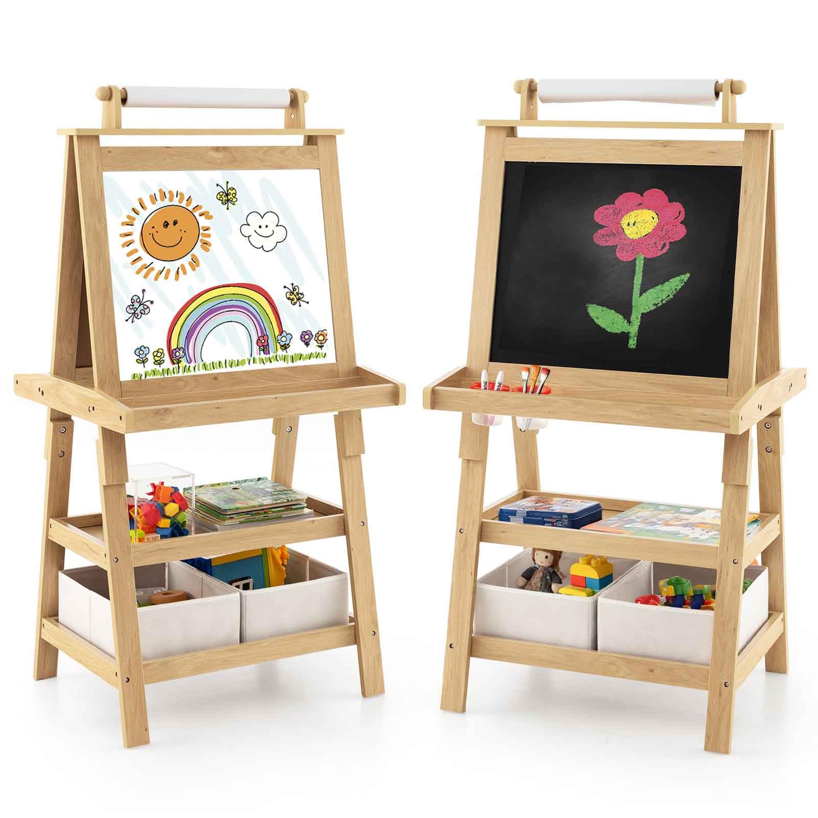 Equipped with a magnetic whiteboard and chalkboard, the young artist can draw with his/her best friend to promote friendship. The top roll with drawing paper provides more space for your artists to perform. The 2 trays on both sides can hold various art accessories for easy access. Featuring 2-tier racks with 2 storage boxes, the easel will provide spacious space to organize art supplies. What's more, sturdy MDF material and stable triangle structure ensure good safety for kids to use. Let your little artists stimulate their imagination and create more works.