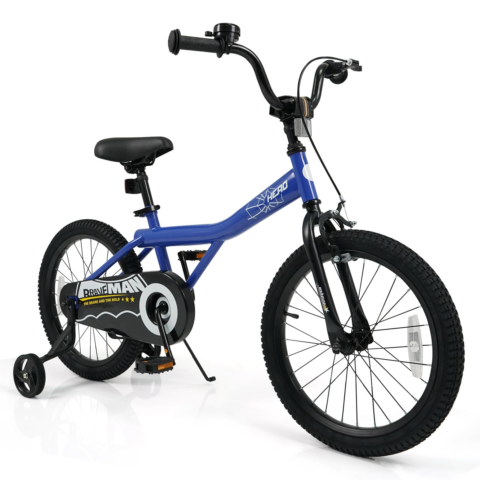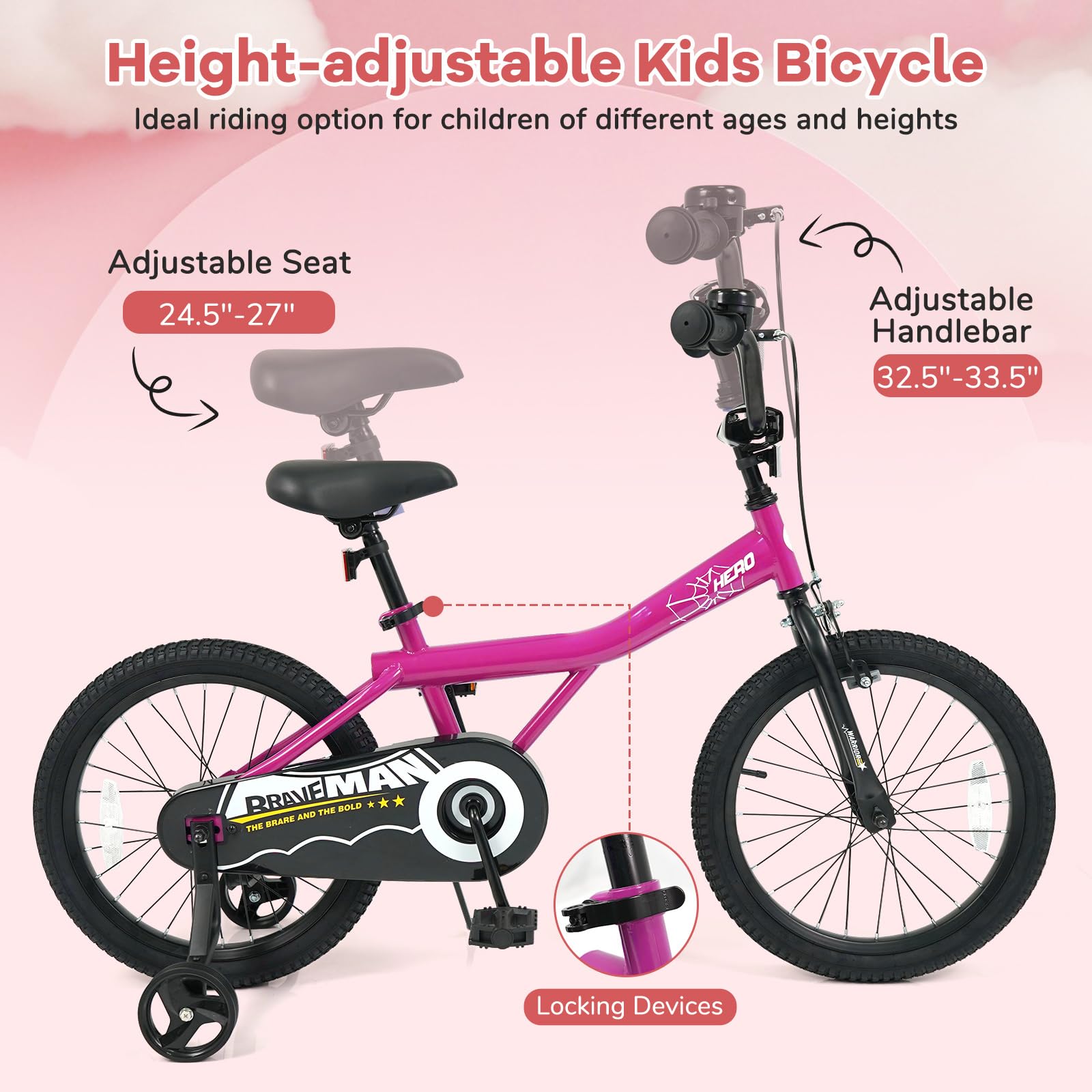 Our 12/14/16/18-inch kids bicycle is specially designed for 3-4/3-5/4-7/4-8 years old young adventurers! The vibrant color and child-friendly size bring fun and excitement to every ride. Height-adjustable design helps your child find the optimal riding height. The enduring rubber tires are crack-resistant and anti-puncture for long-lasting riding. Additionally, the kids bike is equipped with 2 removable training wheels for your child to stay balanced and learn to pedal independently. Plus, children can use a hand brake or rear coaster brake to safely brake. The multiple reflectors ensure higher security in low-light conditions. Furthermore, the pre-assembled bike is super easy to assemble, saving your time and energy.