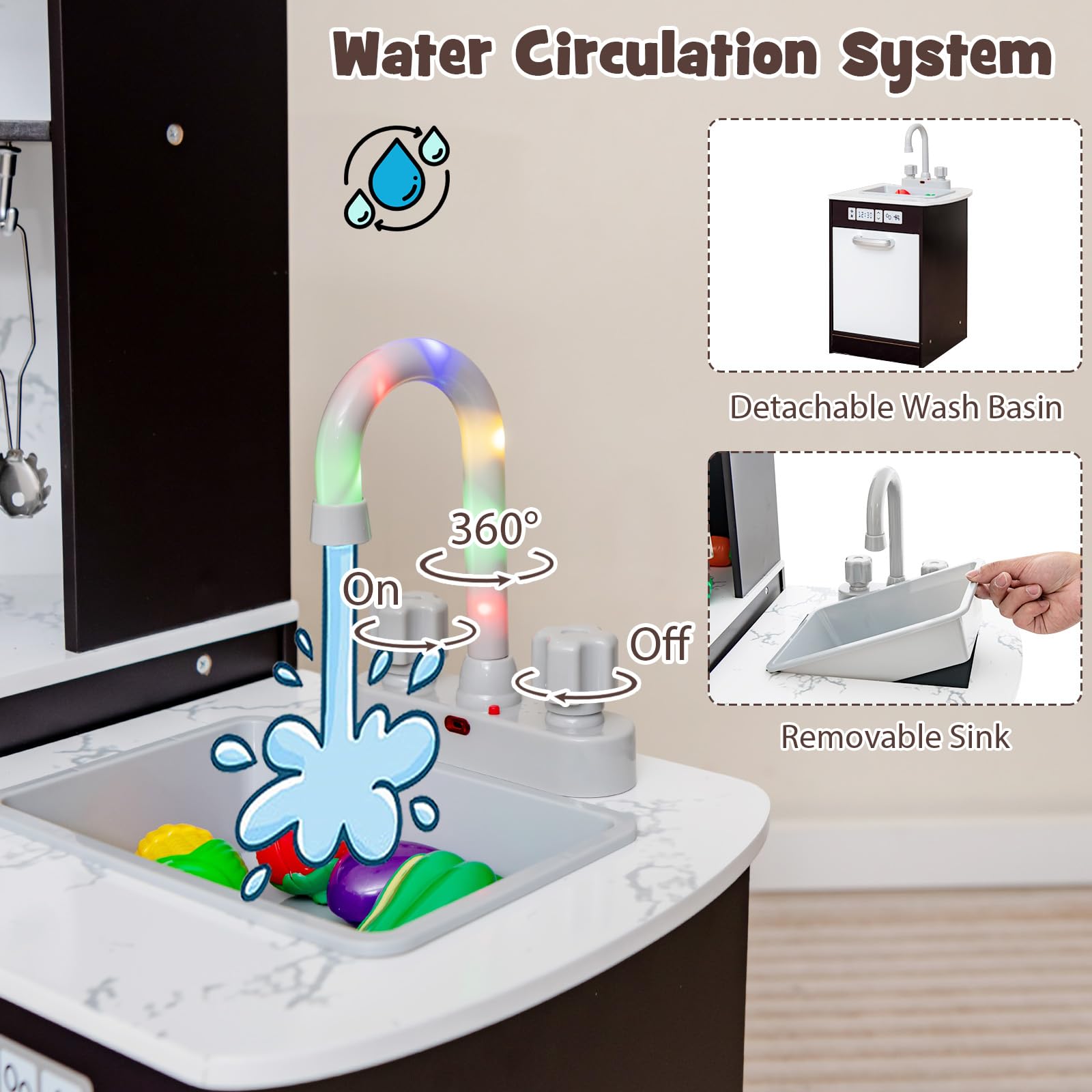 - 【Separated Washing Basin】 Our kids corner kitchen playset comes with a separated washing basin that is equipped with water circulation system. The rotary faucet and detachable sink enable kids to pretend to wash vegetables. Besides, the faucet also features realistic sounds and light. Note: 2 AAA batteries are required, but not included.