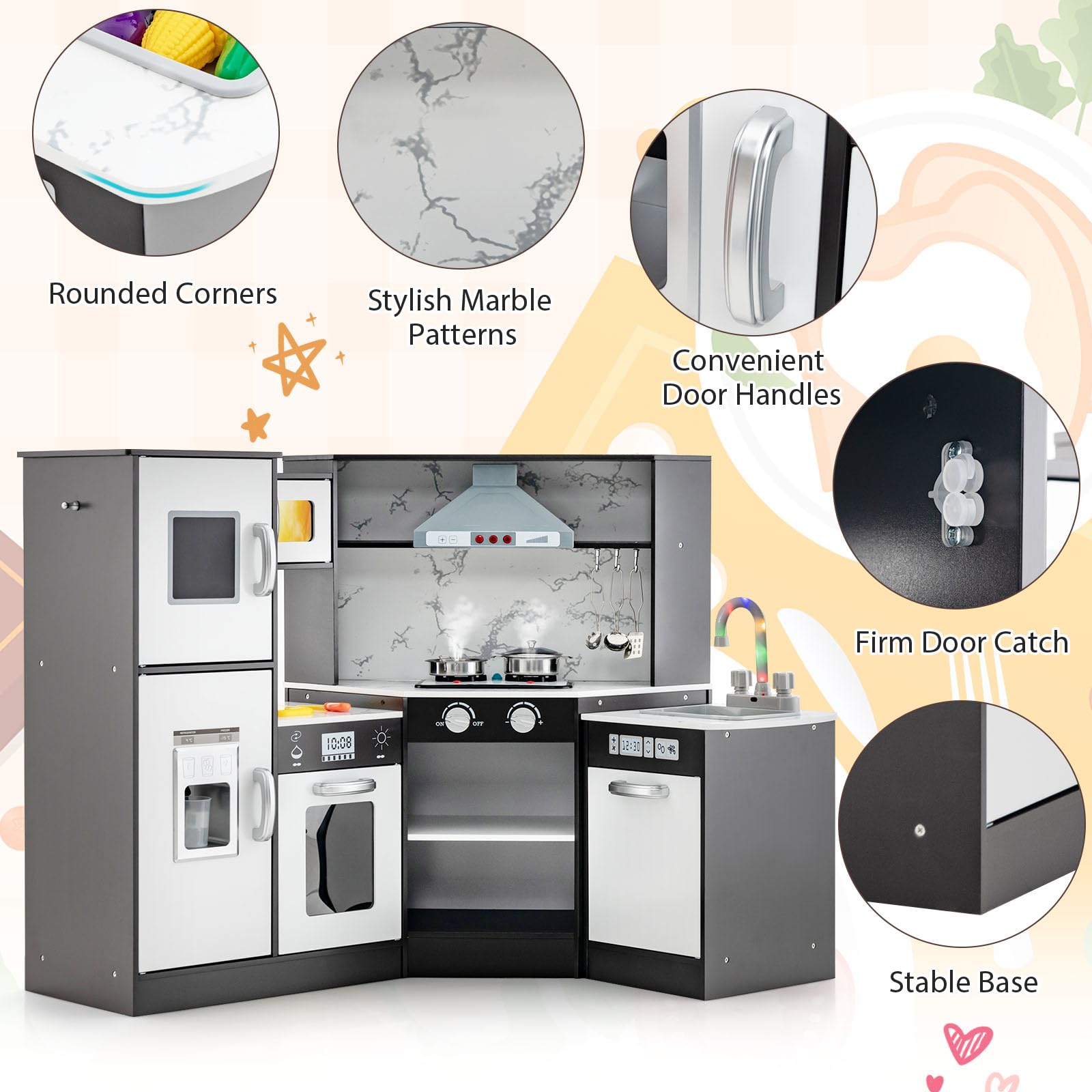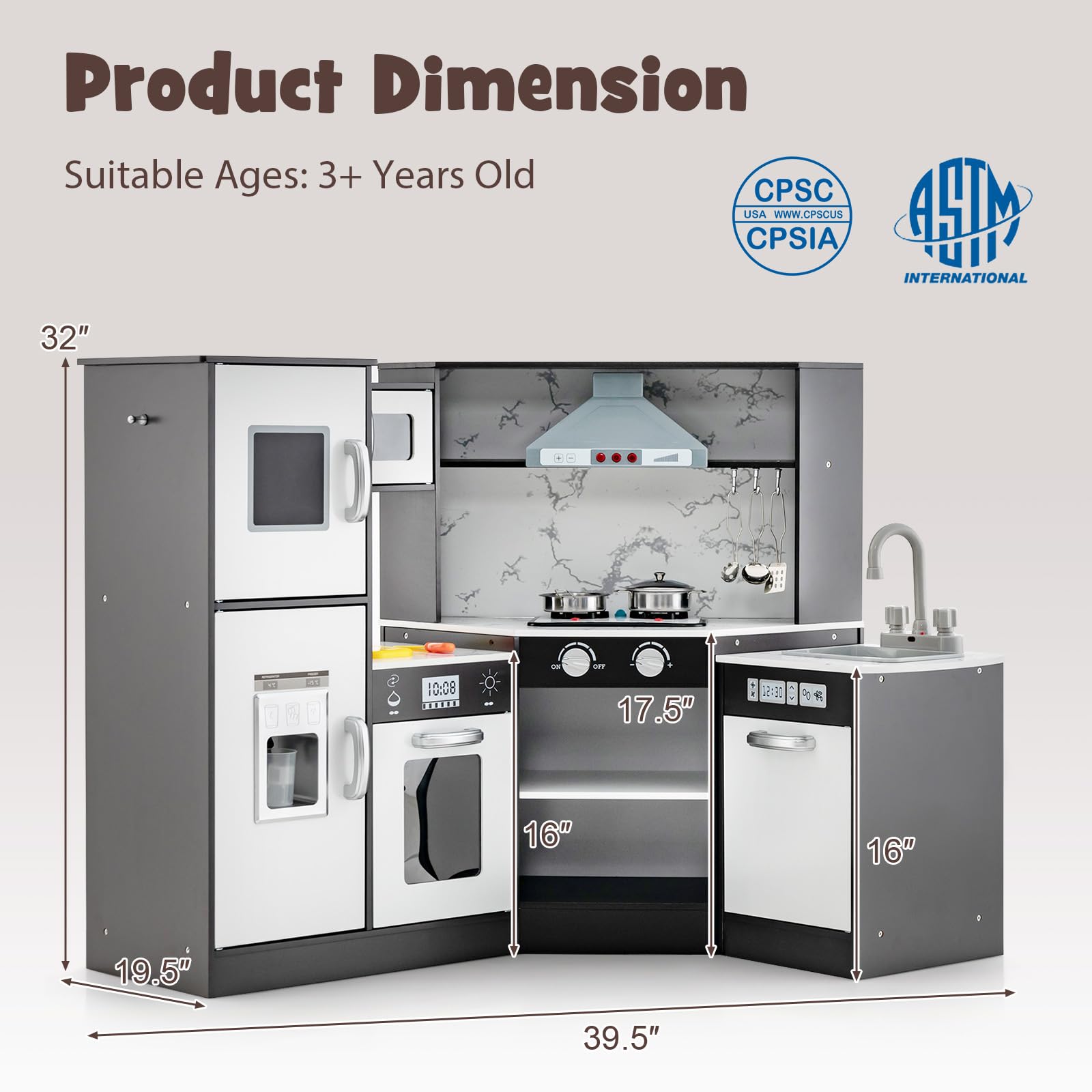 Our kids corner kitchen playset boasts realistic light and sound effects on the microwave, range hood, separate wash basin and stoves. The wash basin also features unique water circulation system for extra fun. And this play kitchen has more interactive areas, such as an ice maker, a chalkboard and rotary knobs. Kids are allowed to simulate washing, baking, lighting or cooking. Moreover, it is equipped with 1 side hook, 1 upper shelf, 2 bottom shelves and 3 utensil hooks for kids to store kitchen accessories. Thanks to its corner design, you can place it in any corner of kid’s room, making it ideal for small spaces. Additionally, it has passed ASTM and CPSIA certifications.