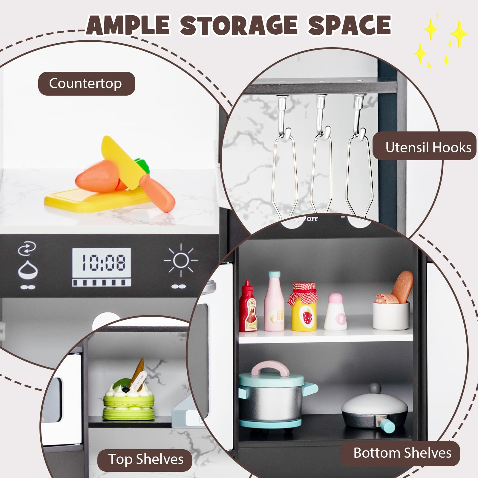 - 【Plenty of Storage Space】 Hook on the left side is a nice place to hang kid’s chef hat or apron. 3 utensil hooks keep the utensil tidy. Upper shelf and 2 open shelves provide enough storage space for different play food to help kids develop a good habit of organizing.