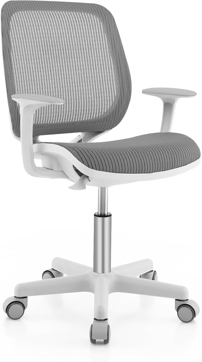 The premium gas lift system and an adjustment lever allow the chair to easily lift up and down. Ergonomic backrest helps kids to develop a good sitting posture. Smooth armrests and elastic mesh seat add more sitting comfort. The breathable nylon mesh fabric ensures heat dissipation and excellent durability. Besides, the 360° swivel seat ensures easy changing direction. 5 flexible wheels allow for easy movement. And the sit-brake wheels will automatically lock when the pressure is over 55 lbs and automatically loose when kids stand up.