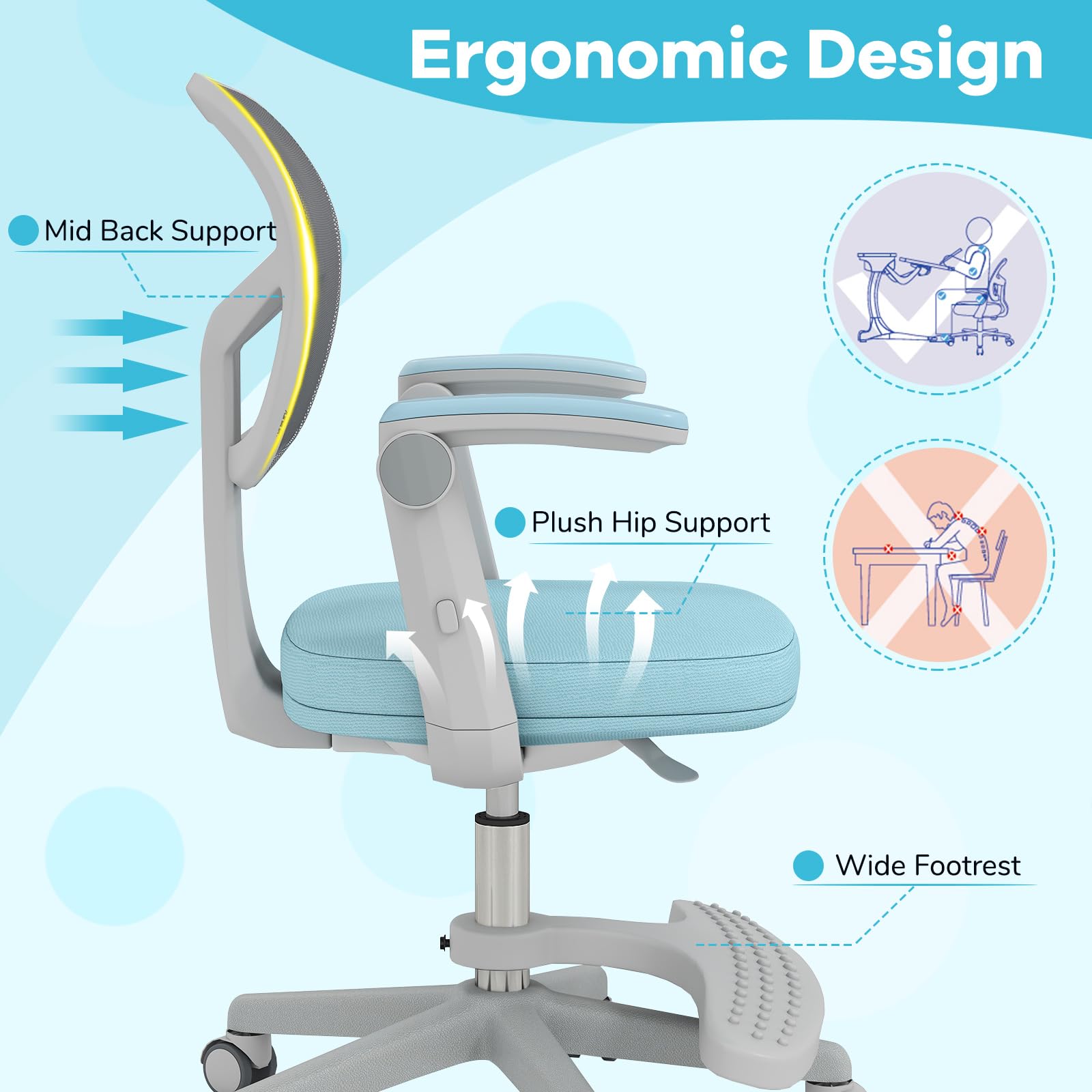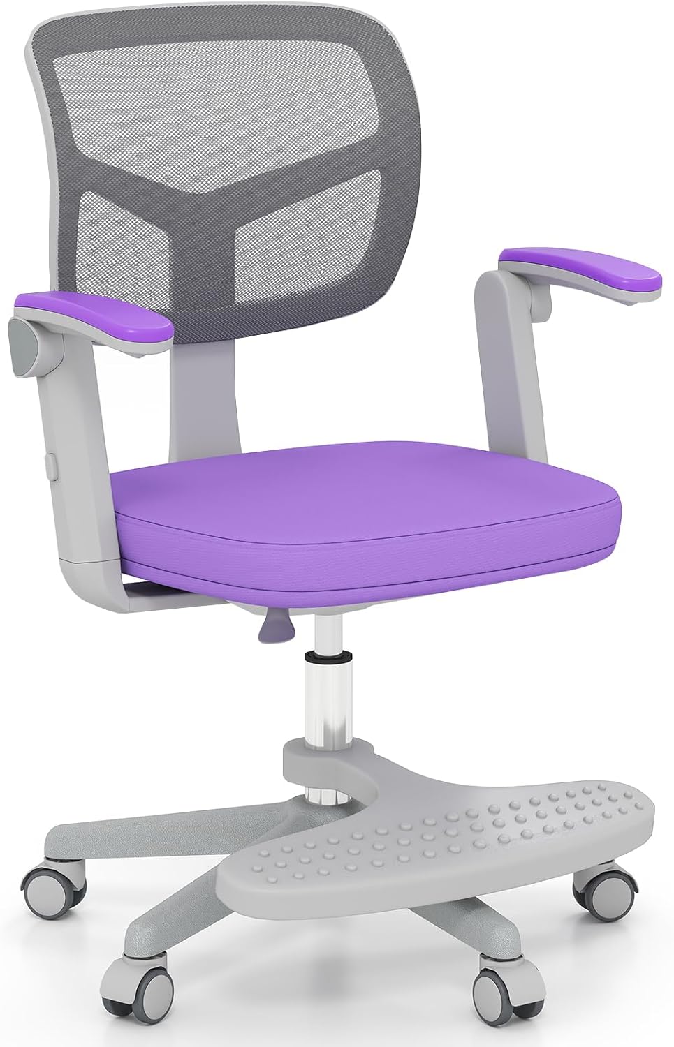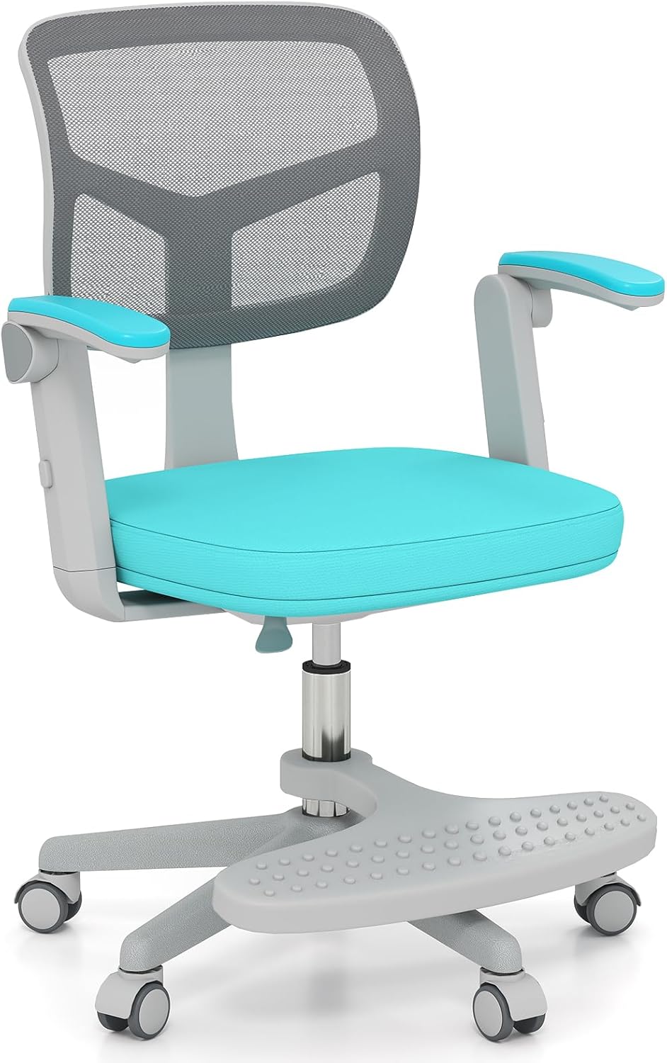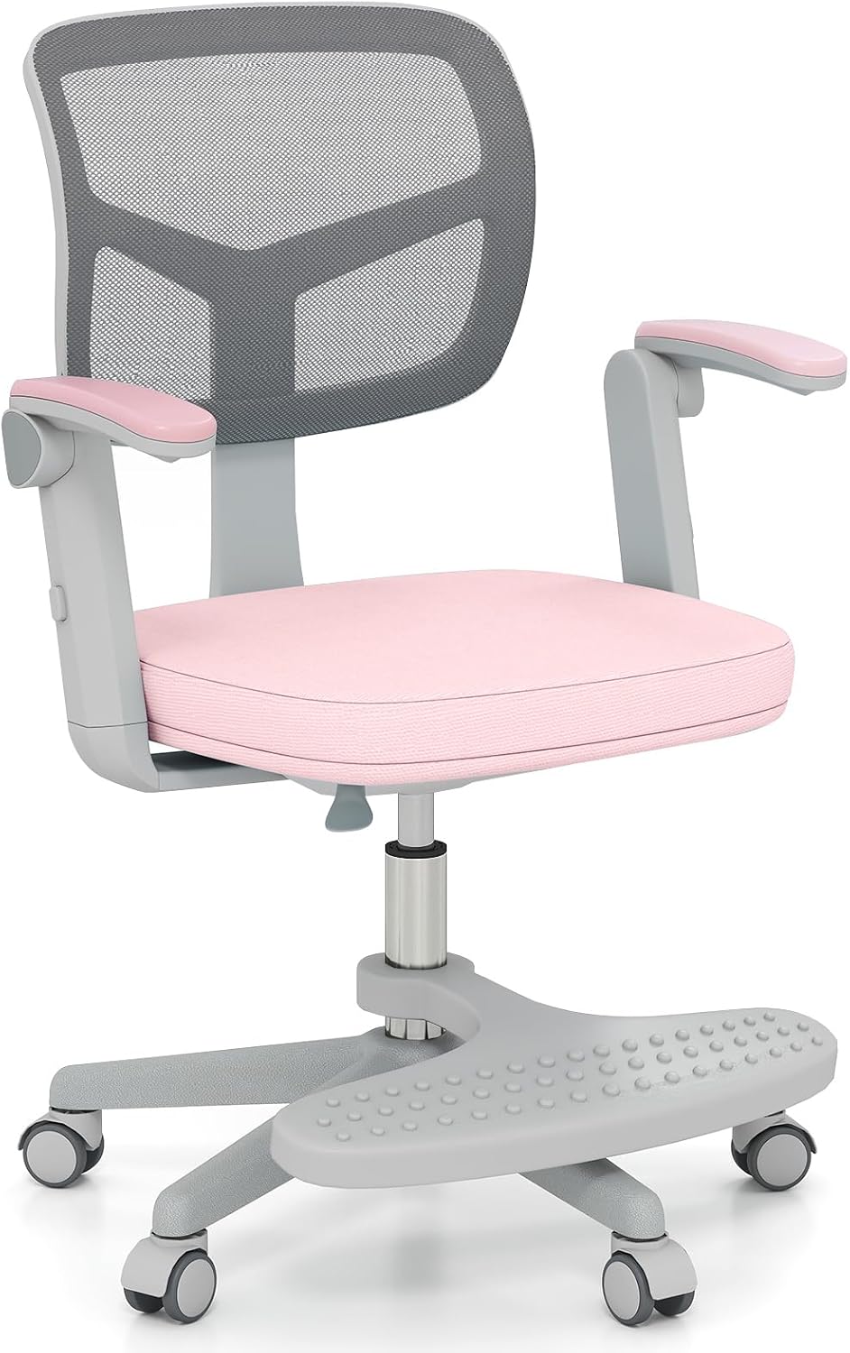 This adjustable kids' desk chair offers a seat height range of 16"-20.5" and a footrest that adjusts from 4"-9" to ensure proper support at every stage. Built to handle kid’s boundless energy, the sturdy 5-claw base and heavy-duty gas cylinder safely support up to 330 lbs, while smooth-rolling wheels let them glide between homework and play. The breathable mesh back keeps little ones cool during long study sessions, and the plush foam seat with removable cover makes cleanup after messy projects simple. Even the armrests flip up to save space when not in use. Optimized for your kids and their space, our study chair is what your growing learner needs!