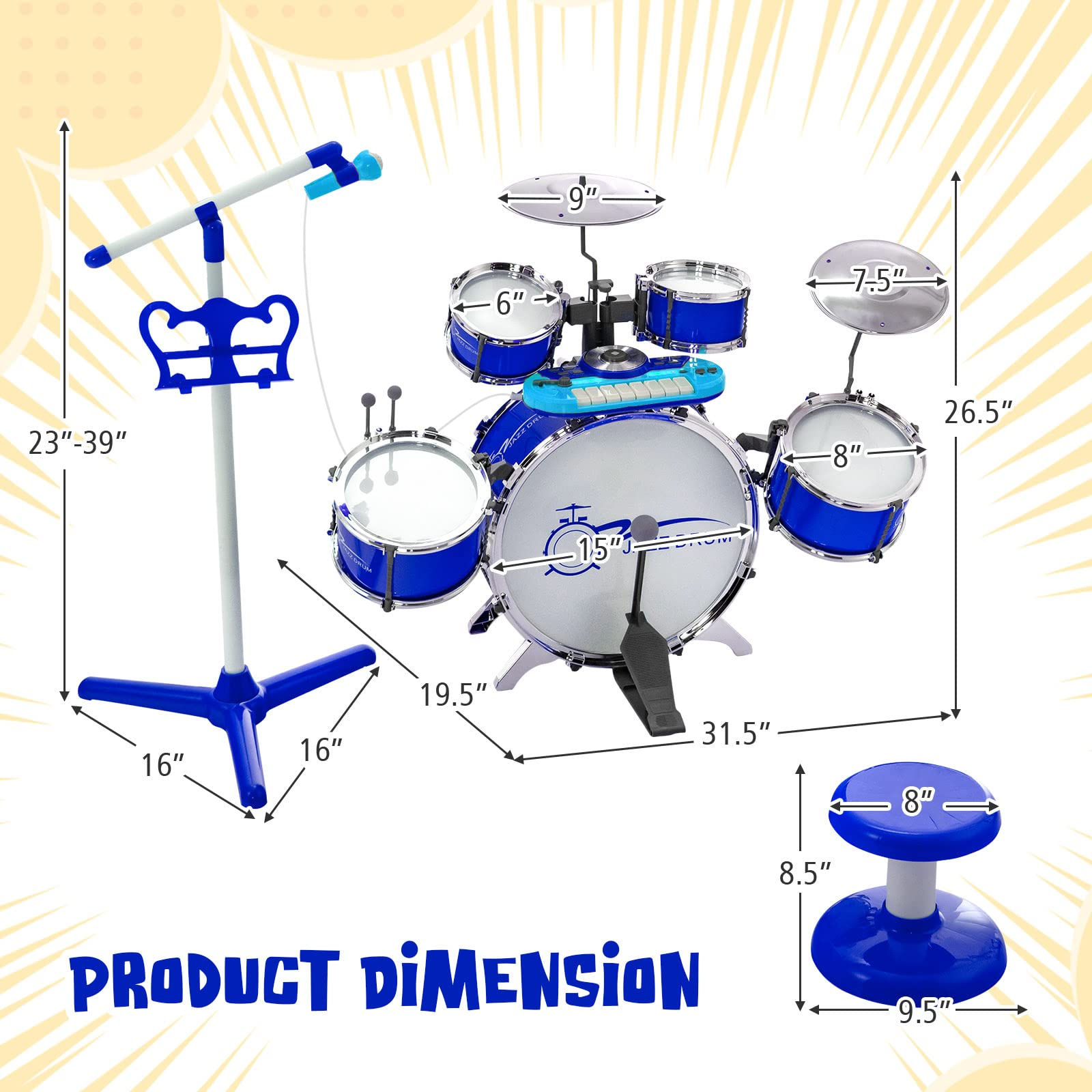 - Complete All-in-One Drum Kit: This musical instrument set is composed of a jazz drum set, 8-key electric keyboard, a microphone stand and a round stool, providing kids a comfortable and complete rock and roll area for recreation. Besides, 2 drums sticks are also included.