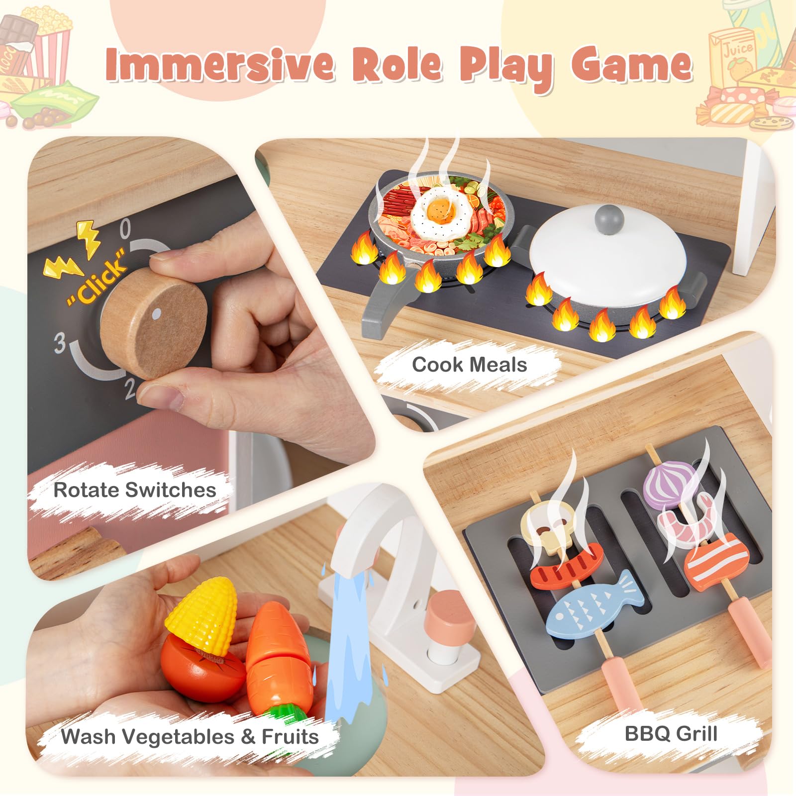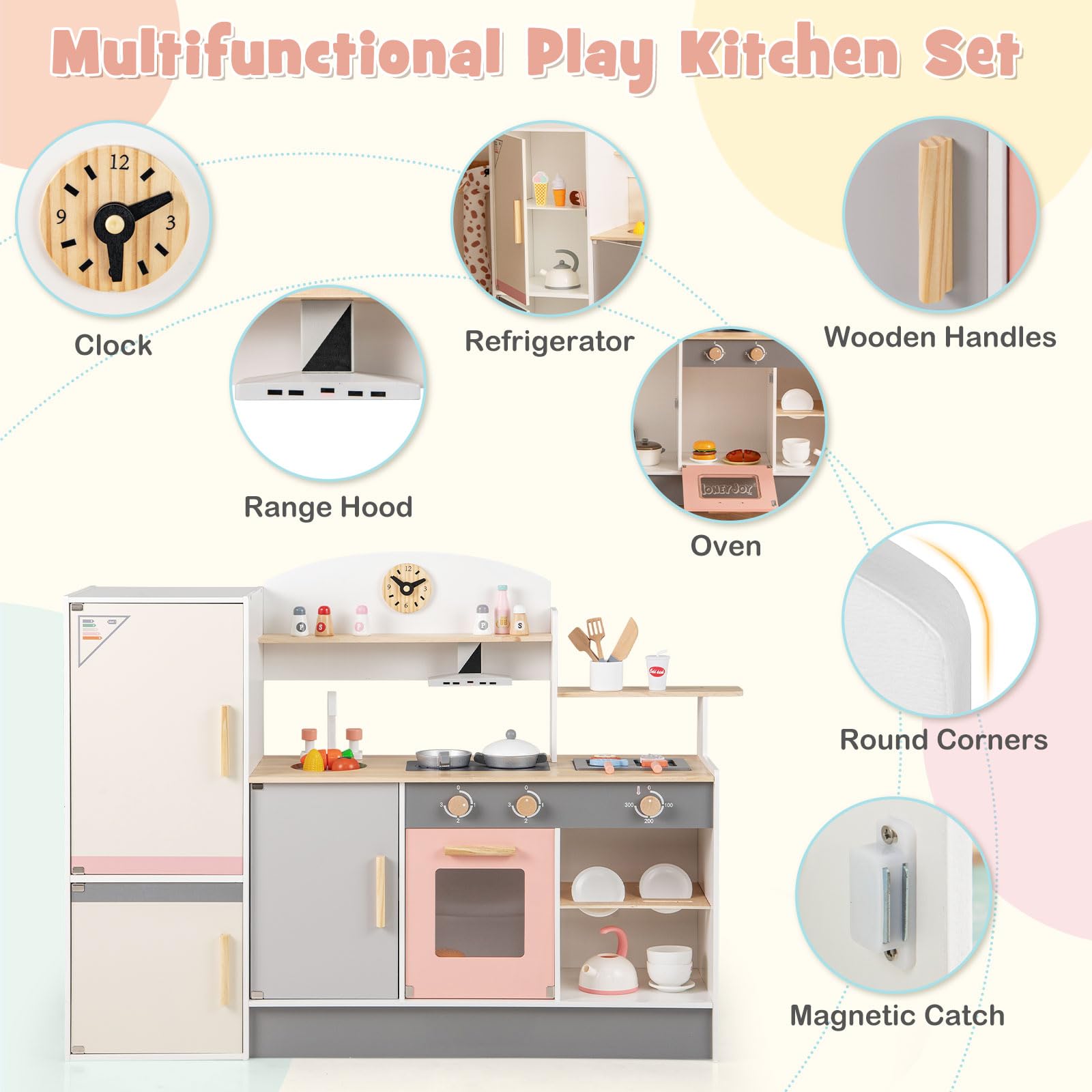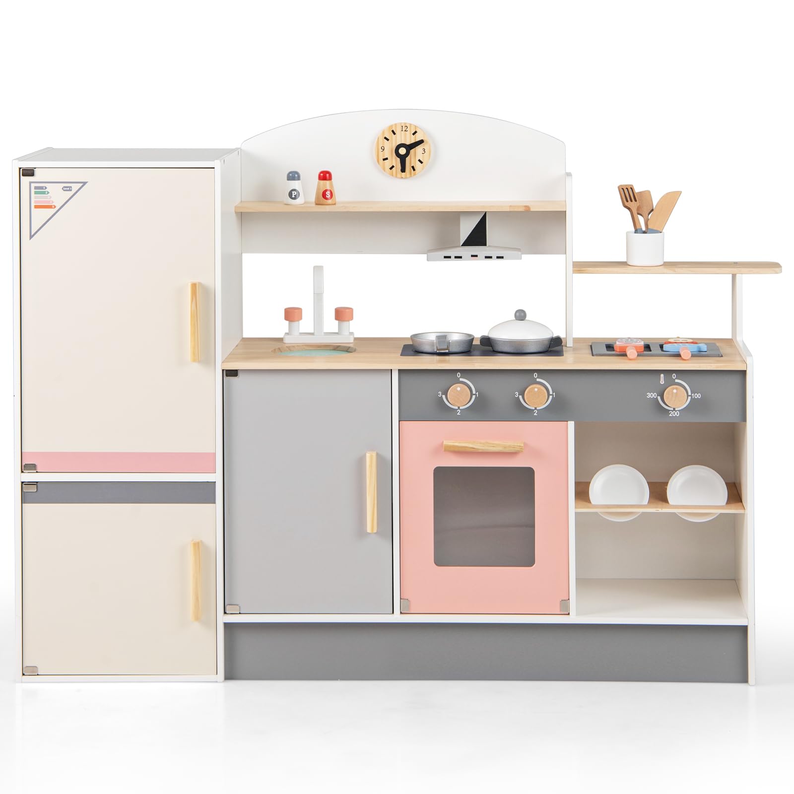 This realistic play kitchen's interactive features include a refrigerator, a range hood, stovetop, BBW grill a sink and facet, and an oven to enhance your little one's play time. This wooden play kitchen also features realistic details including doors that open and close and knobs that click and turn for tons of hands-on fun. This toddler kitchen encourages role play and promotes your little chef’s imagination and creativity. A set of 16 accessories is included. After cooking, dishes can be neatly stored in the dish rack. The durable MDF construction is kid-safe and stable. This little chef play kitchen is perfect for your little one’s bedroom or play area.