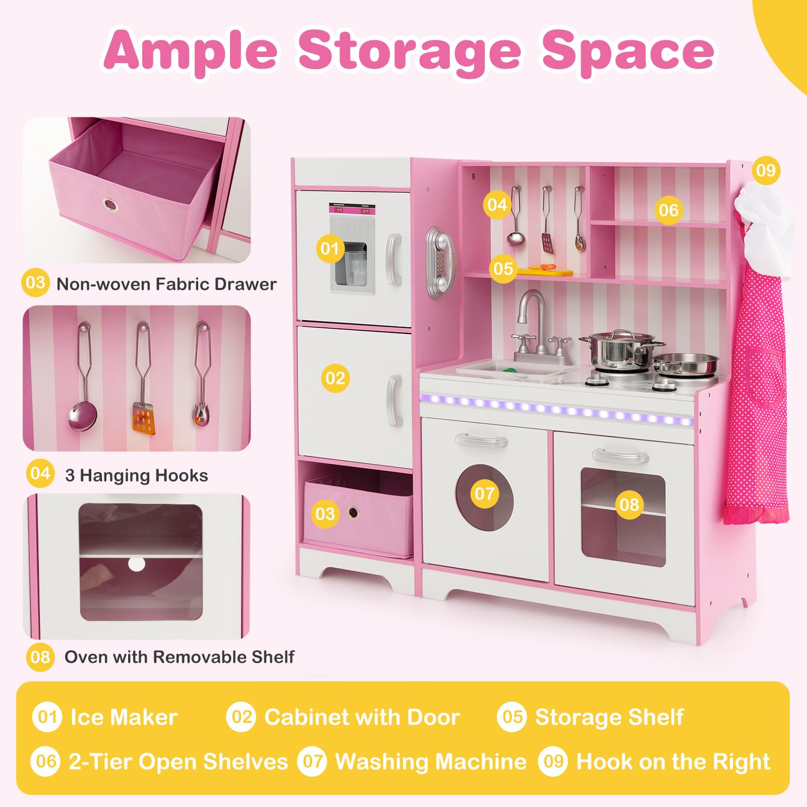 Kids can pretend to cook food, cut food, wash vegetables, bake bread and make ice cubes to acquire cooking fun. Meanwhile, the adjustable LED lights with 7 colors also bring your little one extra joy. Toddlers can also use the telephone toy to simulate phoning their friends. And there are 16 kitchen accessories to ensure a more realistic experience. Additionally, we equip it with ample storage space to help kids learn to well organize their toys. All corners and edges are rounded and burr-free to avoid scratching. And certified by ASTM and CPSIA certifications, our play kitchen is safe enough for 3 + years old kids.