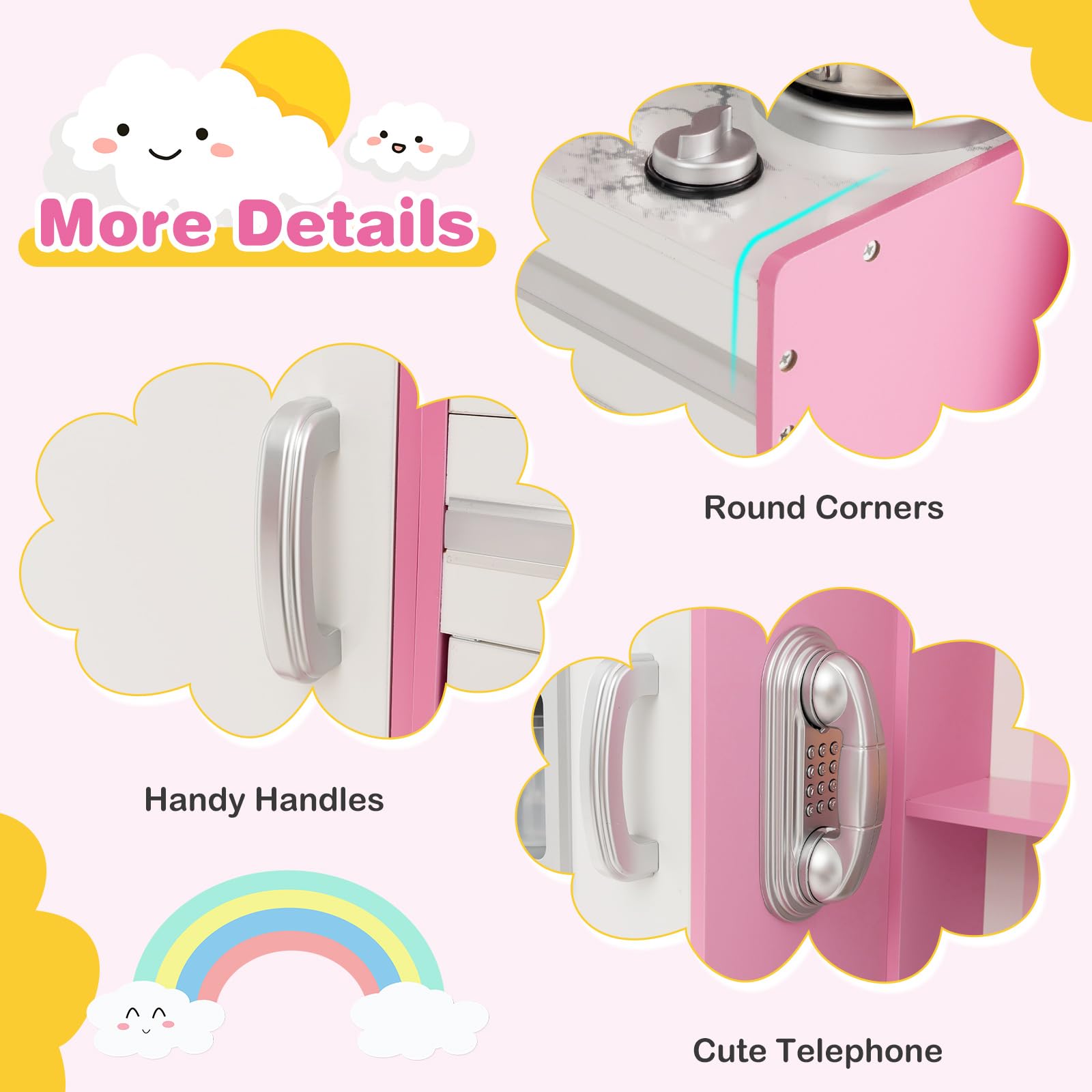 - 【Realistic Cooking Experience】The play kitchen has a stovetop, a washing machine, an oven with removable shelf, a cute telephone, a faucet & sink. Kids can pretend to mix different food, turn the clicking knobs, wash veggies & fruits and clean toy clothes. And kids can put, press and enjoy the ice cubes with our realistic ice maker.?