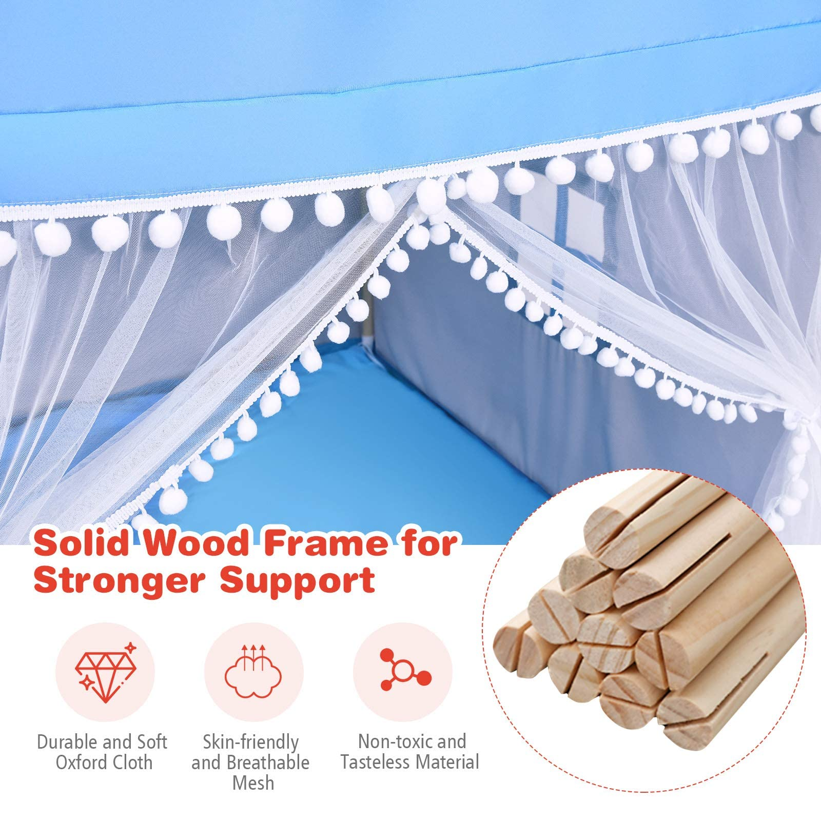 Just like a real house, this playhouse tent can be very stable with its solid wood frame. Soft and thick mat is included for creating a super comfortable sitting feeling. The whole house is covered with non-toxic and odorless oxford cloth, and you can rest assured that your kid will always be in a safe environment. Adorable door and windows are not only for decoration, but also for air circulation. And it is big enough for your kids to create their own private space both indoor and outdoor.