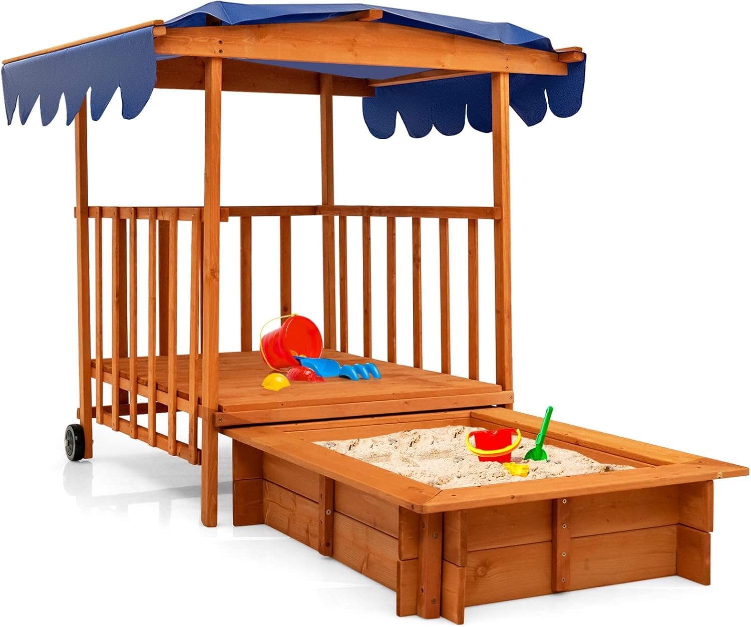 Retractable Sandbox : Our kids sandbox is designed with a wooden playhouse. The large playhouse ensures a spacious area for kids to play. You can detach the playhouse panels and push the sandbox in to create a cool playing environment, while you can also separate the sandbox individually for your kids to play under the sunshine.