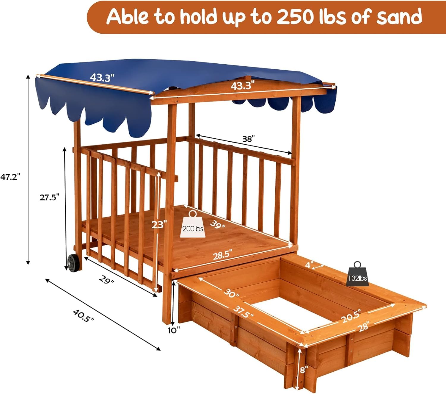 Solid Construction : Safety guardrails can better protect kid's safety when they play with their friends in the playhouse. And the sandpit is certified by ASTM and CPSIA for security. Our sandpit is also strong and stable. The playhouse can hold up to 200 lbs, while each seat of sandbox can support up to 132 lbs. Movable rear wheels enable you to move it forward and backward.
