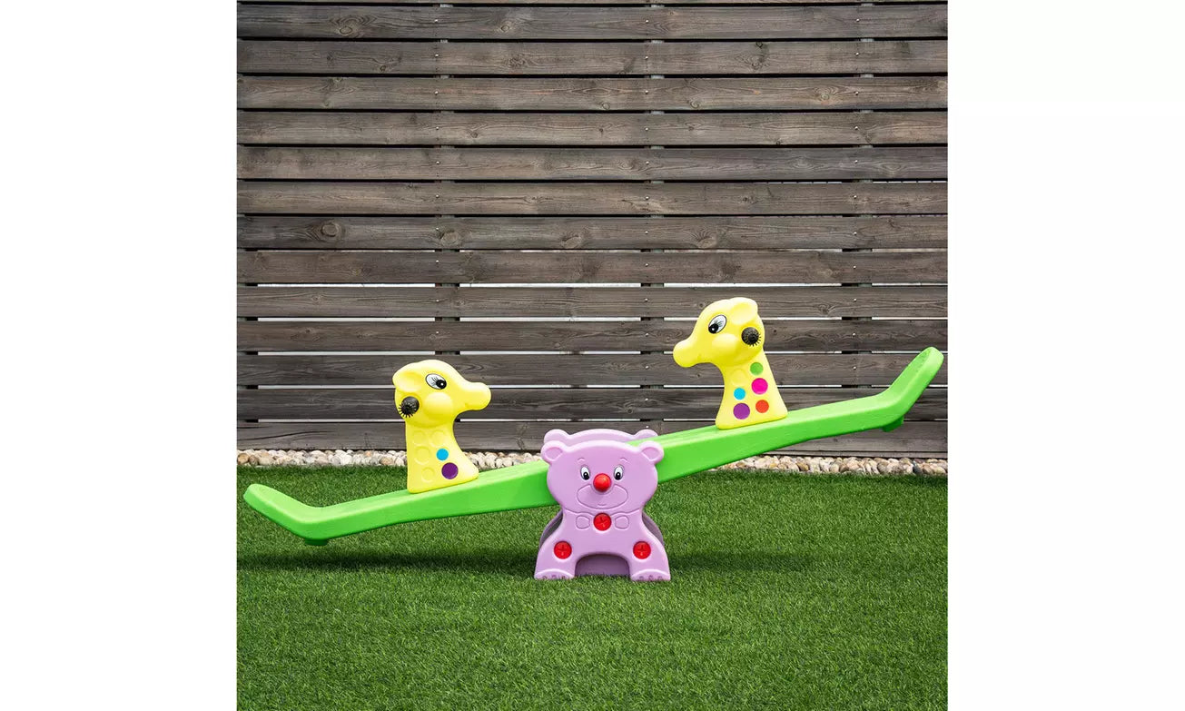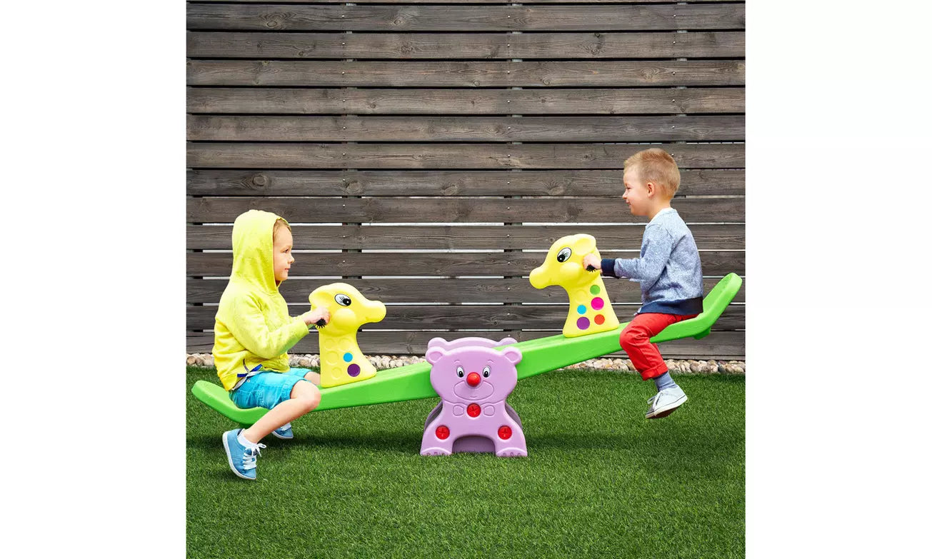 The Kids Seesaw is perfect for two children to play together. The easy grip handles and cute design make it a backyard favorite for any fun-loving kids. Stopper pole under each seat is available. Give your children a present and they can improve their coordination. It can accompany your children to grow older which has maximum weight capacity of 110 lbs.