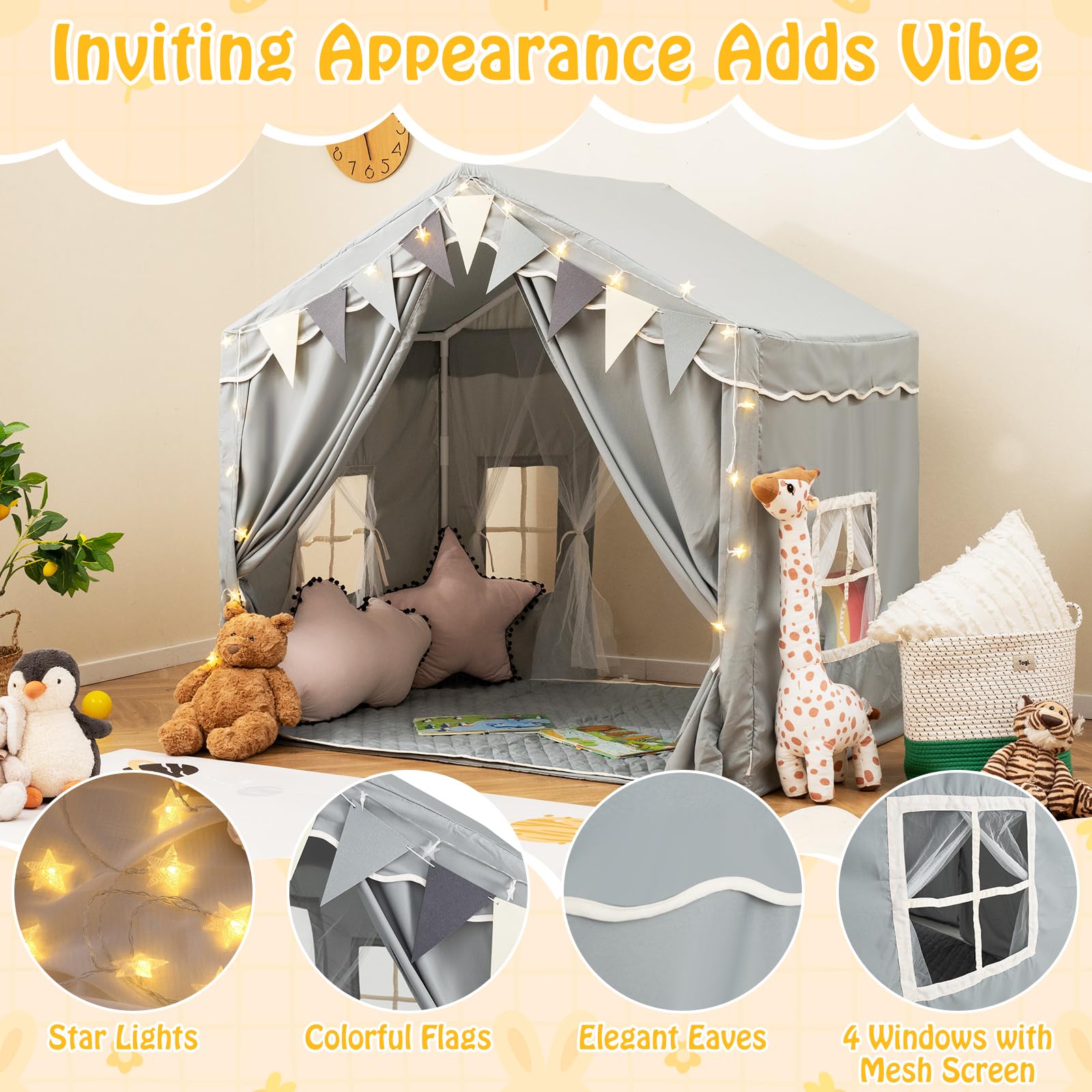 - [ Inviting Appearance Adds Vibe ]: Featuring enchanting star light string, elegant ruffled eaves and colorful pennant banners, the large playhouse will enhance the ambience of kids’ play area and sparkle endless entertainment for them.