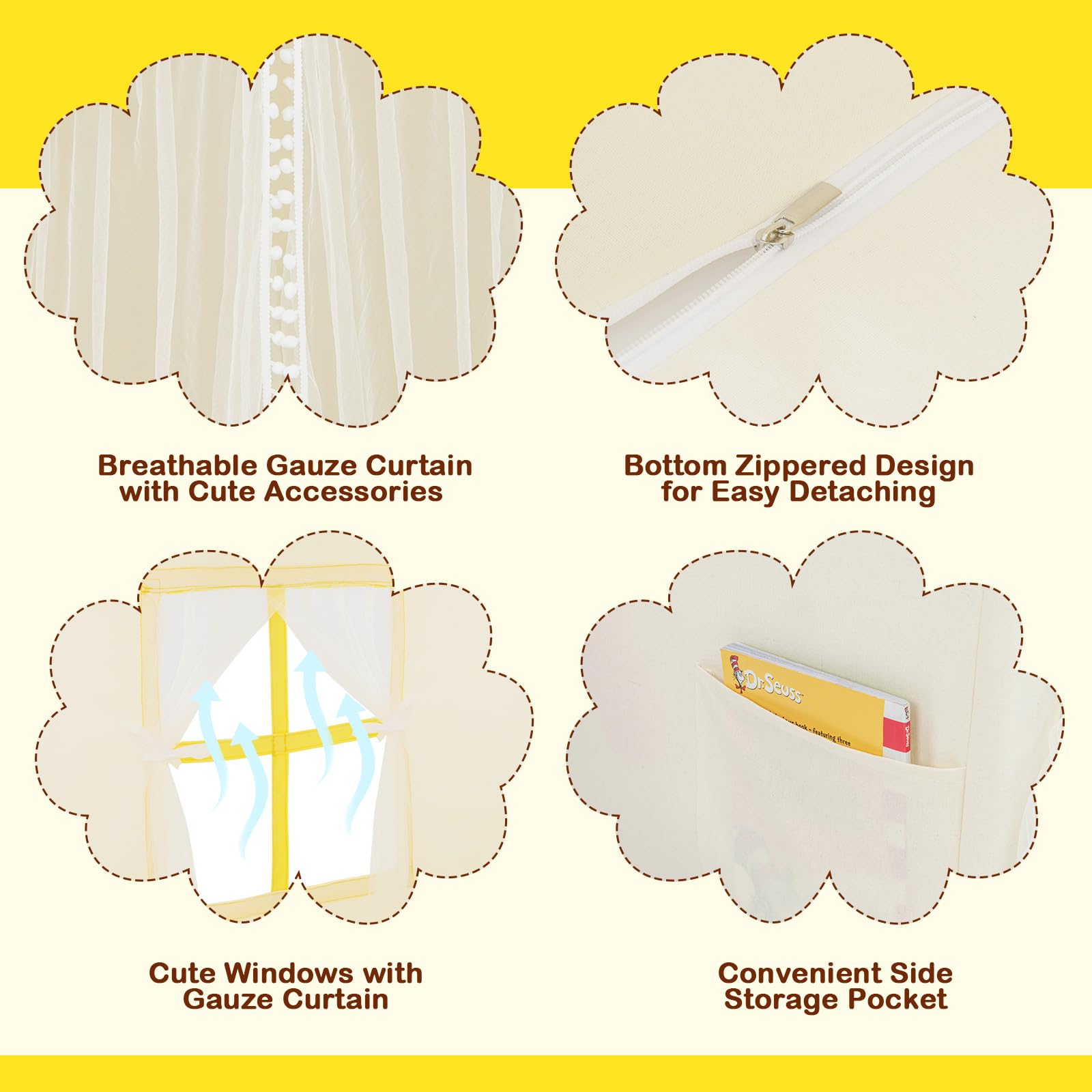- [ Soft & Comfortable Design ]: The kids playhouse adopts a premium polyester cotton canopy, ensuring a soft and cozy environment for children. Moreover, the included soft cotton mat with pillows provides extra comfort for sitting, lying, or playing. The tent is easy to maintain, which offers the convenience of machine-washable canopy and hand-washable mat, saving time and effort. Besides, it features ASTM and CPSIA certification.