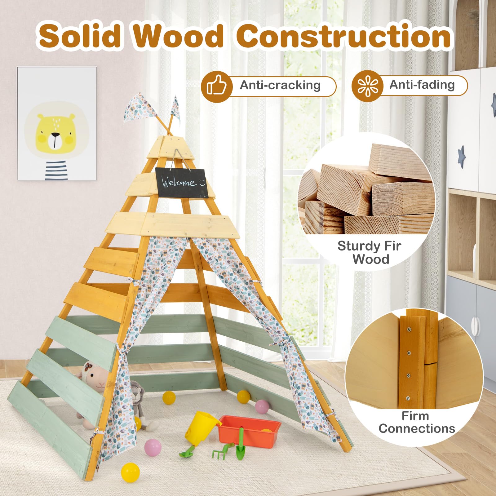 Crafted from high-quality fir wood, this hideaway playhouse creates a safe environment for little explorers to play, hide, and unleash their energy. The removable chalkboard serves as an artistic canvas for your kids, allowing them to express themselves through drawing, writing, and more. In addition, the wooden play tent is a perfect gift for kids aged 3-8 years old and suitable for the kids’ room, kindergarten, or outdoors. As a developmental tool, it encourages motor skills, coordination, and social skills. Furthermore, the flags and curtains with cartoon patterns are machine washable for hassle-free cleaning.