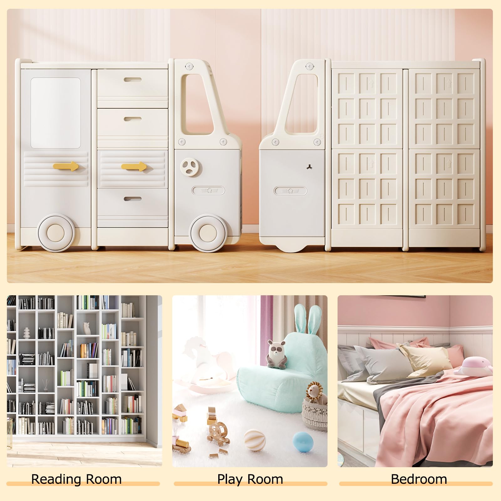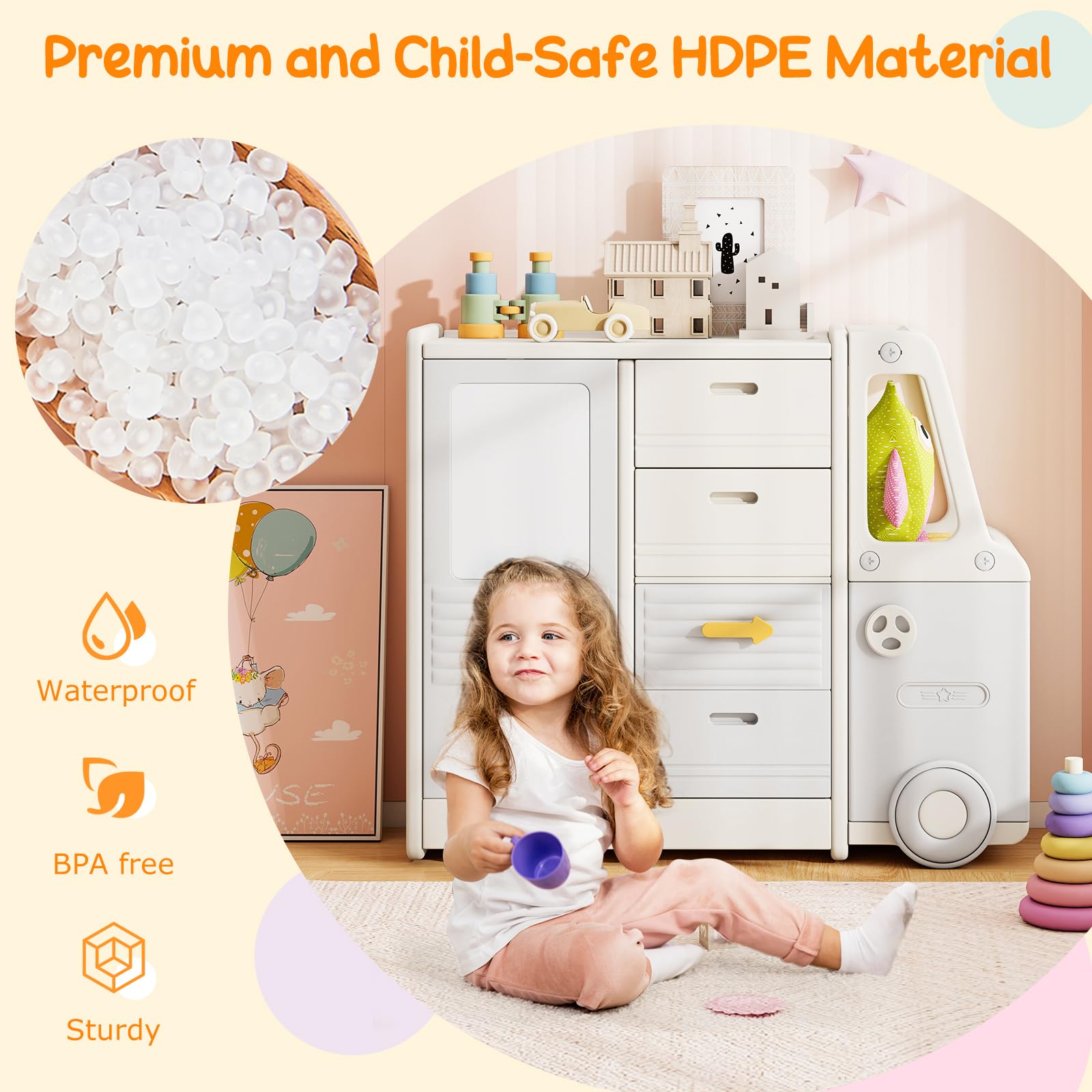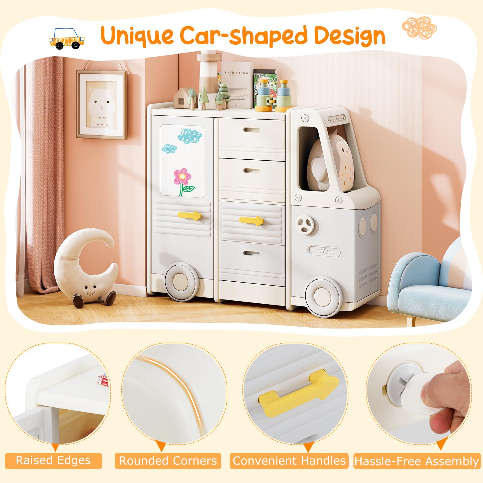 With a generously sized top, 4 pull-out drawers, 2 cabinets, and a front storage area, the children's storage cabinet offers ample space for toys, books, and art supplies. The integrated white drawing board encourages artistic expression, making it ideal for creative drawing and writing. Constructed from child-safe HDPE and PP materials, the toy organizer offers lasting durability and utmost safety with its rounded corners and smooth surfaces. Its charming car-shaped design and practicality make it an excellent addition to nurseries, playrooms, reading rooms, and bedrooms alike. Watch your little ones enjoy tidiness and creative play, all in one adorable package!