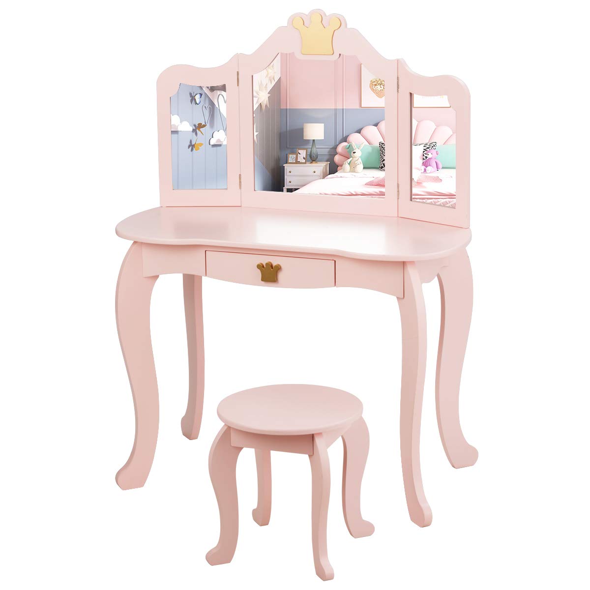This kids vanity set is a perfect present for your little girl. The vanity set has been tested from EPA and the paint we choose is lead-free and has no peculiar smell. Made of premium density board, the whole vanity set is very sturdy and can be used for long time. Comes with a tri-folding mirror, your little one can adjust the angle of mirror conveniently to get much light and make up better. The dresser also has a drawer to help store small items such as hair ties, brushes, makeup, nail polish and other fun trinkets. In addition, the mirror can be removed and the table is also can be used for writing or reading. Designed in pretty and cute appearance, the vanity set will add a touch of elegance to your child's room.