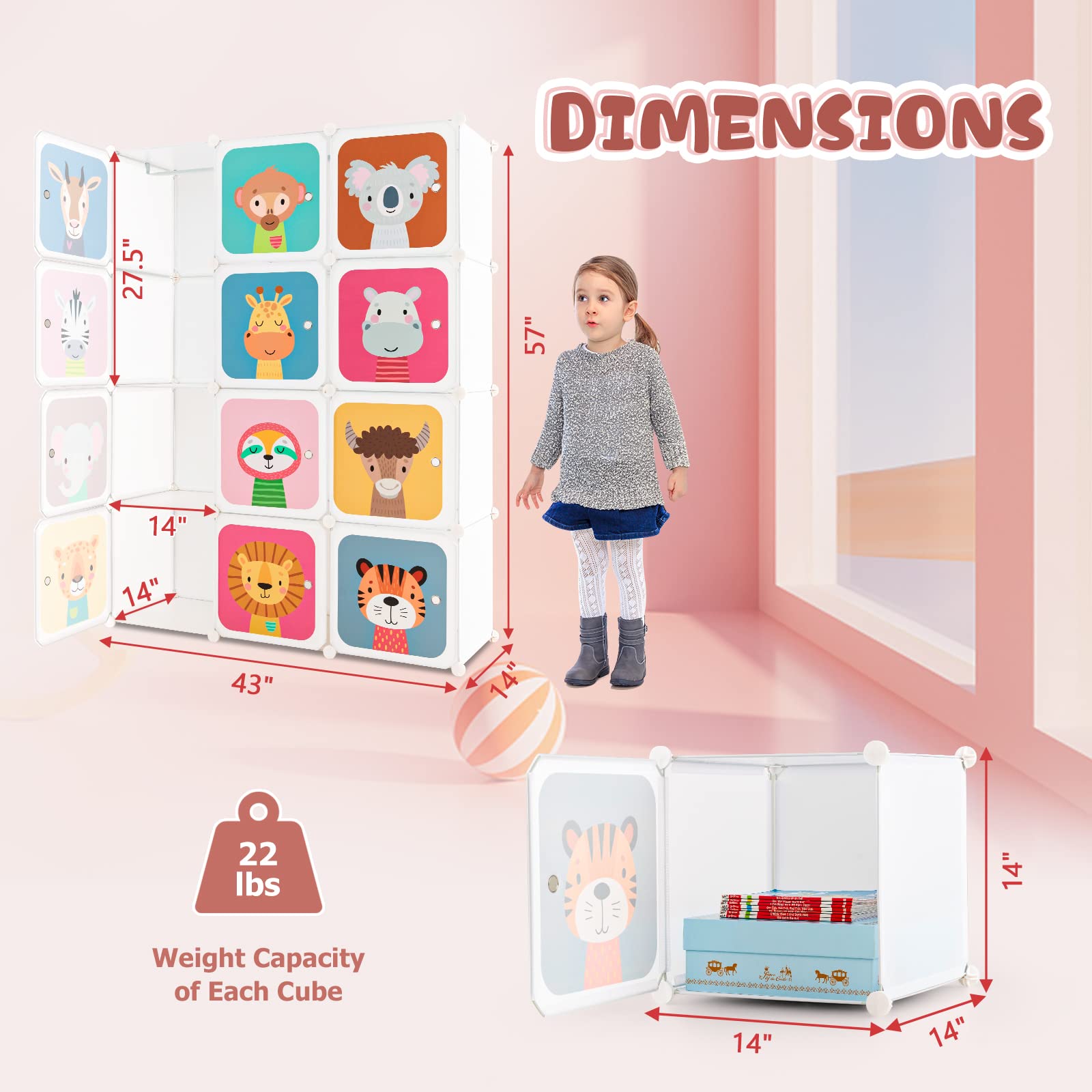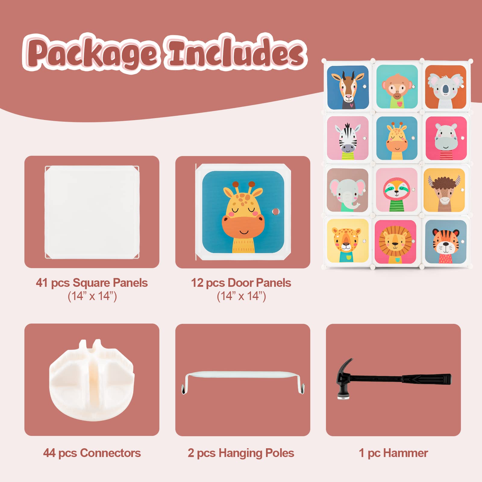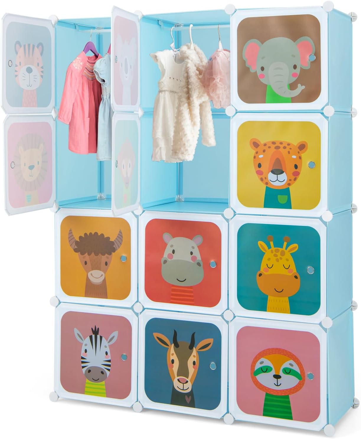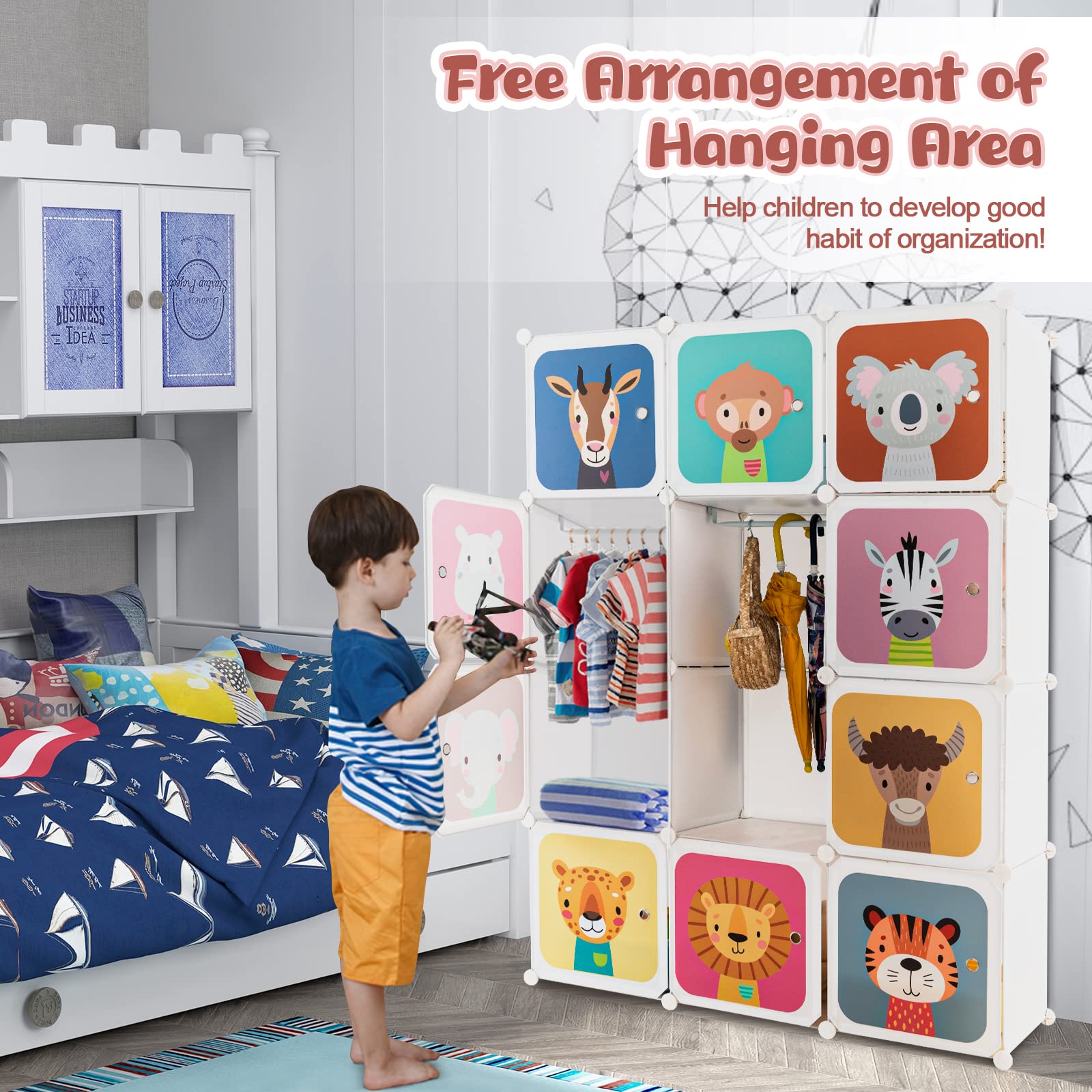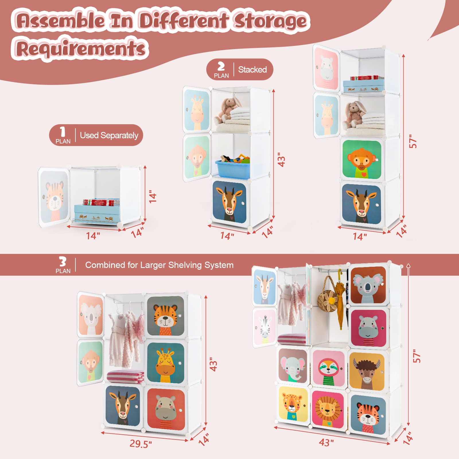 This 12-cube kids wardrobe is an optimal storage solution and an ideal decoration to your home. It consists of 8 storage cubes and 2 hanging sections, perfectly meeting different storage needs. Each cube can be used separately, or be stacked and combined to form a customized design. The cube storage organizer offers large capacity to bring you a clean and tidy space. Plus, it features cute animal patterns and has an adorable appearance, and is suitable for many places like kids room, bedroom and dressing room. Made of quality materials, the children armoire is safe, durable and smooth, requiring simple maintenance to save you more entertainment time.