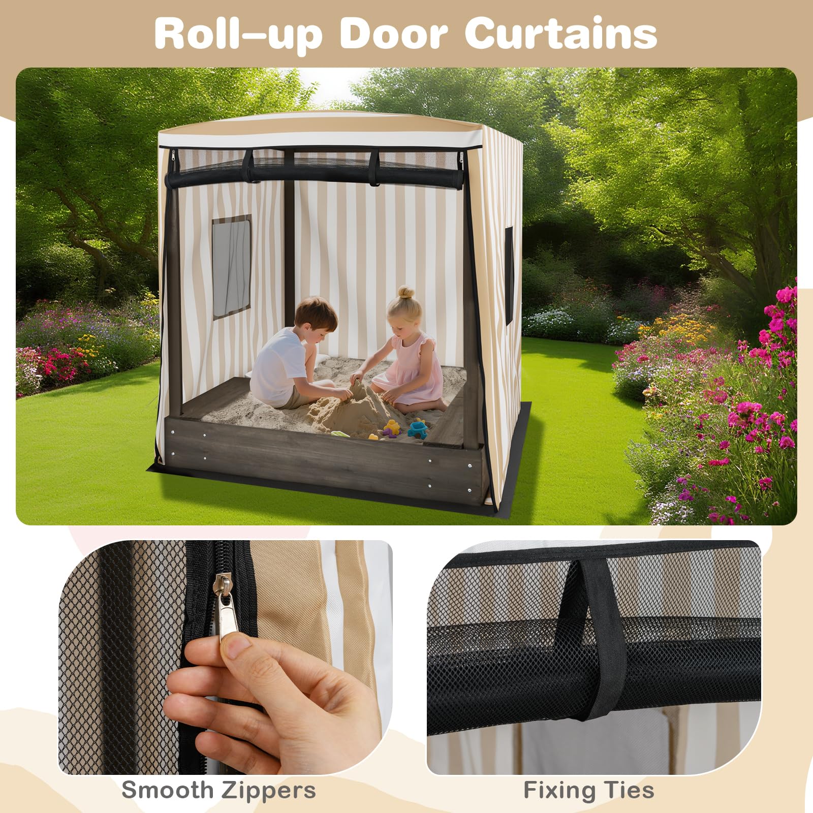 This large wood sand pit features construction from sturdy fir wood for enduring use. Topped with a waterproof oxford cloth canopy, it offers comprehensive protection for little ones. Children can sit and play for hours thanks to the built-in bench seats. The under-seat storage space and foldable storage box keep the play area tidy. Designed to encourage fun and safe play, the kids wooden sandbox boasts a bottomless design with a protective liner that facilitates excellent ventilation and drainage. It can hold up to 661 lbs of sand and comfortably fit 3 kids. Additionally, the mesh door and windows ensure excellent ventilation, boasting zippers and ties on the door for easy access.